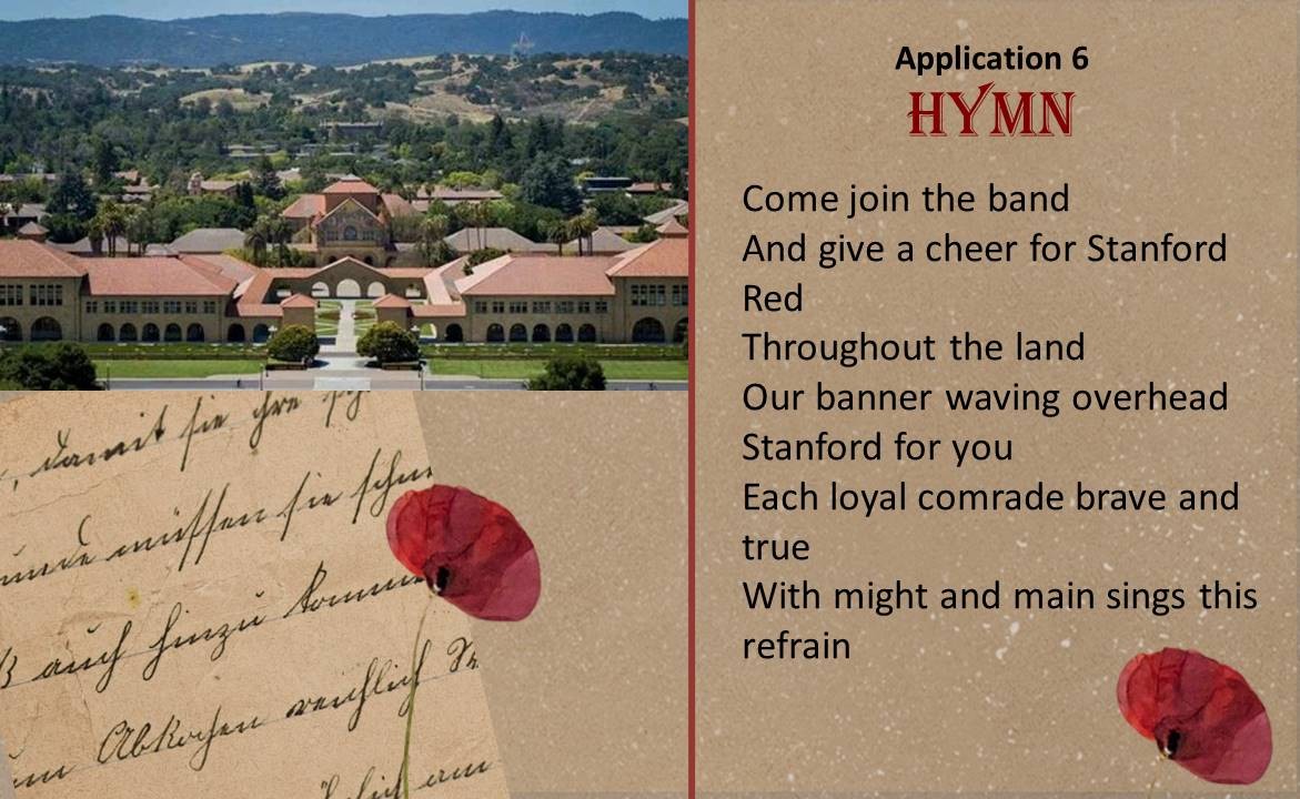 (49 slide) Come Join The Band is the official fight song of Stanford University. The lyrics were written in 1907 by screenwriter and playwright Aurania Ruverall, then a Stanford student.