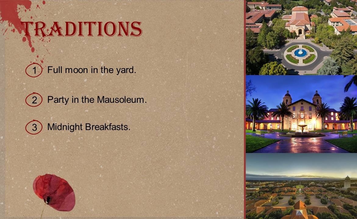 - full moon on the quad. Students gather on the main quad, and seniors exchange kisses with freshmen.