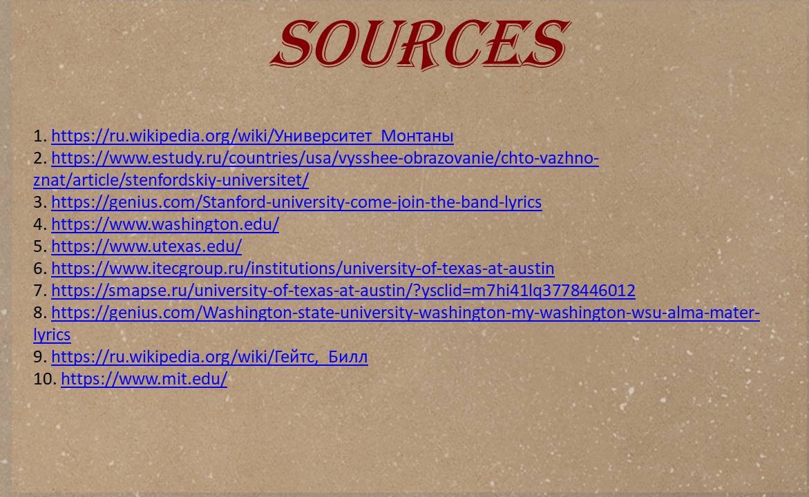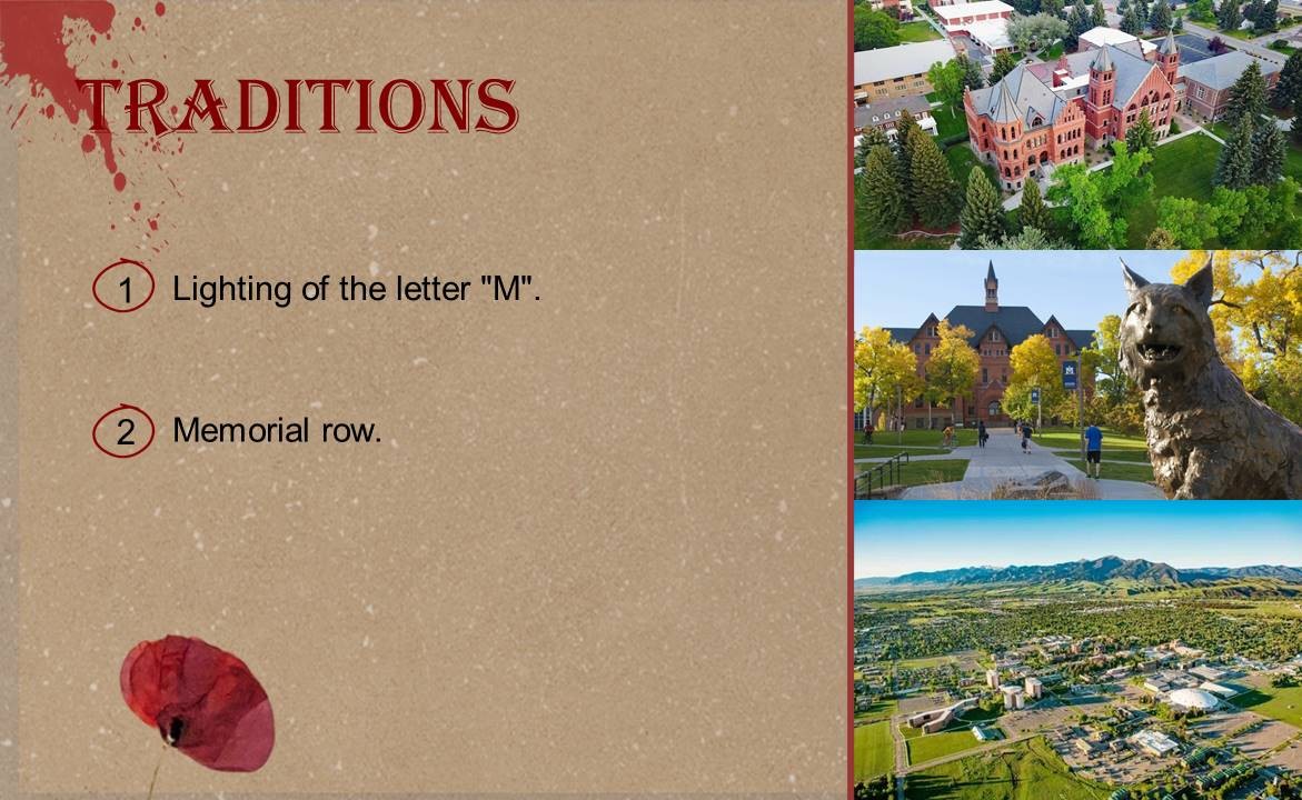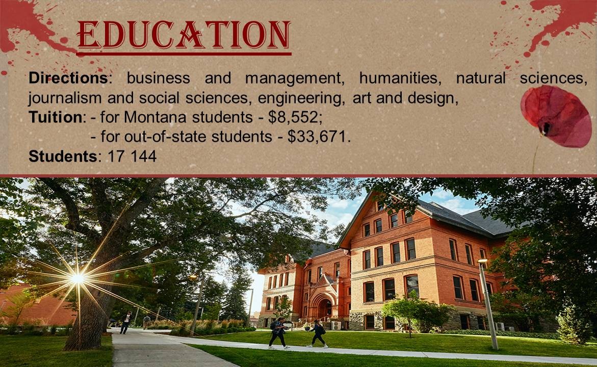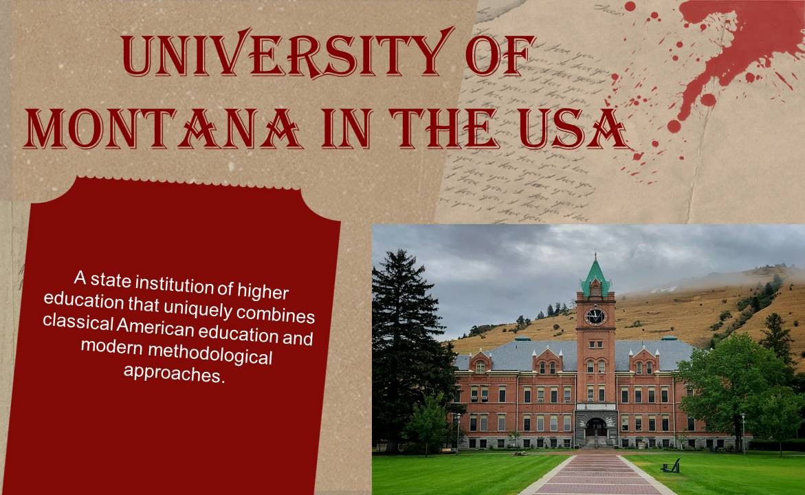 (59 slide) The University of Montana in the United States is a state institution of higher education that uniquely combines classical American education and modern methodological approaches. The first student intake was in 1883, and already at that time more than 700 people were enrolled in the course, which was considered a colossal success. A state institution of higher education that uniquely combines classical American education and modern methodological approaches.