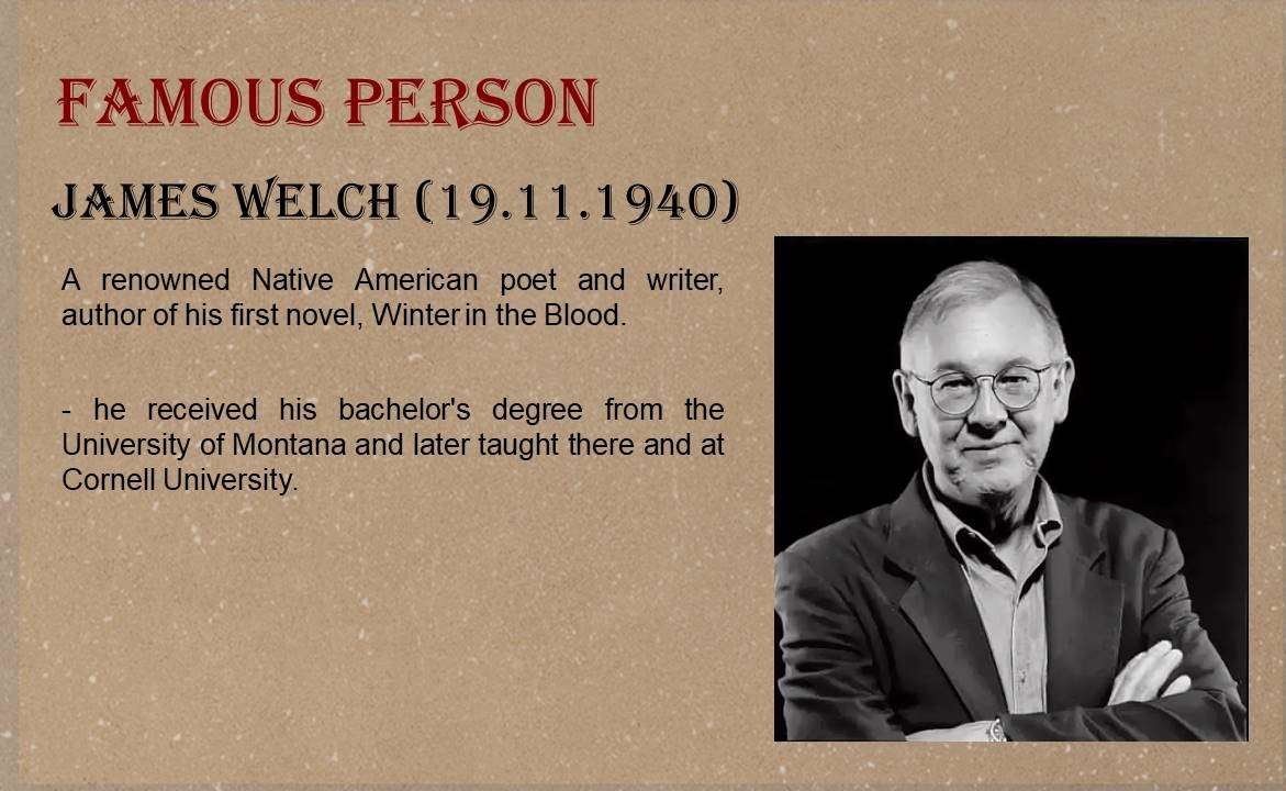 (66 slide – 2 click) He is a famous American poet and writer, the author of his first novel, Winter in the Blood.