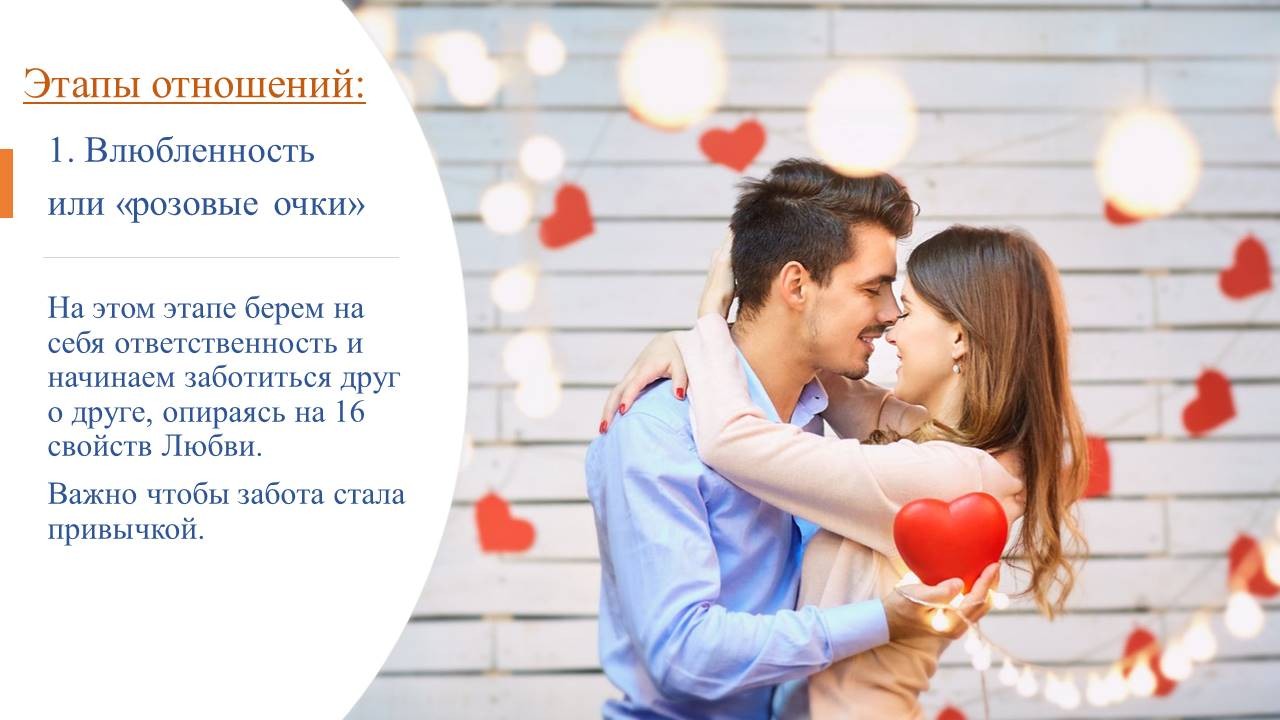 На первом этапе отношения прекрасные, так как влюбленные видят друг в друге только хорошее, они не замечают плохое и сами стараются проявлять только положительные качества характера. Это состояние счастья! На этом этапе важно выработать привычку заботиться друг о друге, взять на себя такую ответственность. Заботу проявлять, ориентируясь на 16 свойств любви, о которых мы говорили раньше.