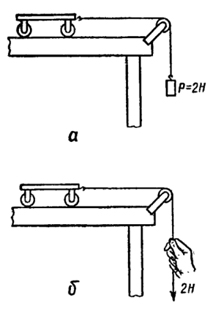 - Две тележки. Второй закон Ньютона гласит, что одинаковые силы сообщают телам равных масс равные массы. Почему же в таком случае тележка, изображенная на рисунке 1,а, набирает скорость медленнее, чем тележка, показанная на рисунке 1,б, хотя массы тележек одинаковы [2, С.17]?