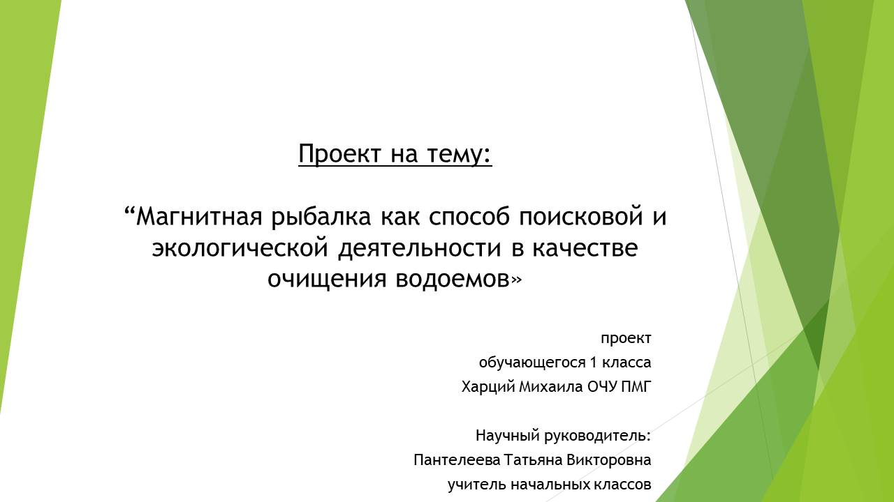 Проектная деятельность "Магнитная рыбалка" Пантелеева Татьяна Викторовна, учитель начальных классов Разделы: Внеклассная работа, Экология, Патриотическое воспитание, Человек и природа: конфликт или гармония? Класс: 1 Ключевые слова: проектная деятельность Работа выполнена в форме презентации 15.04.2025