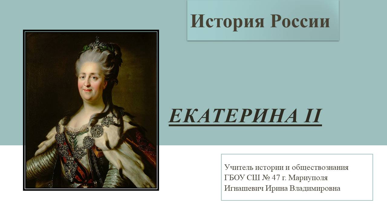 История России: Екатерина II Игнашевич Ирина Владимировна, учитель истории и обществознания Разделы: История и обществознание Класс: 8 Работа выполнена в форме презентации 22.04.2025