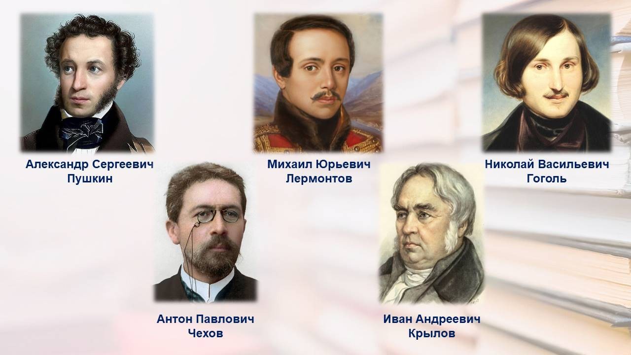 Слайд 3. Пушкин А.С., Лермонтов М.Ю., Гоголь Н.В., Чехов А.П., Крылов И.А.