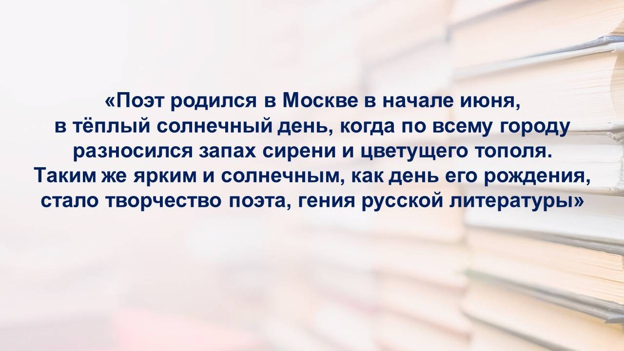 “Поэт родился в Москве в начале июня, в тёплый солнечный день, когда по всему городу разносился запах сирени и цветущего тополя. Таким же ярким и солнечным, как день его рождения, стало творчество поэта, гения русской литературы” В 12 лет родители отдали сына учиться в Царскосельский лицей). (Слайд 6. А.С.Пушкин).