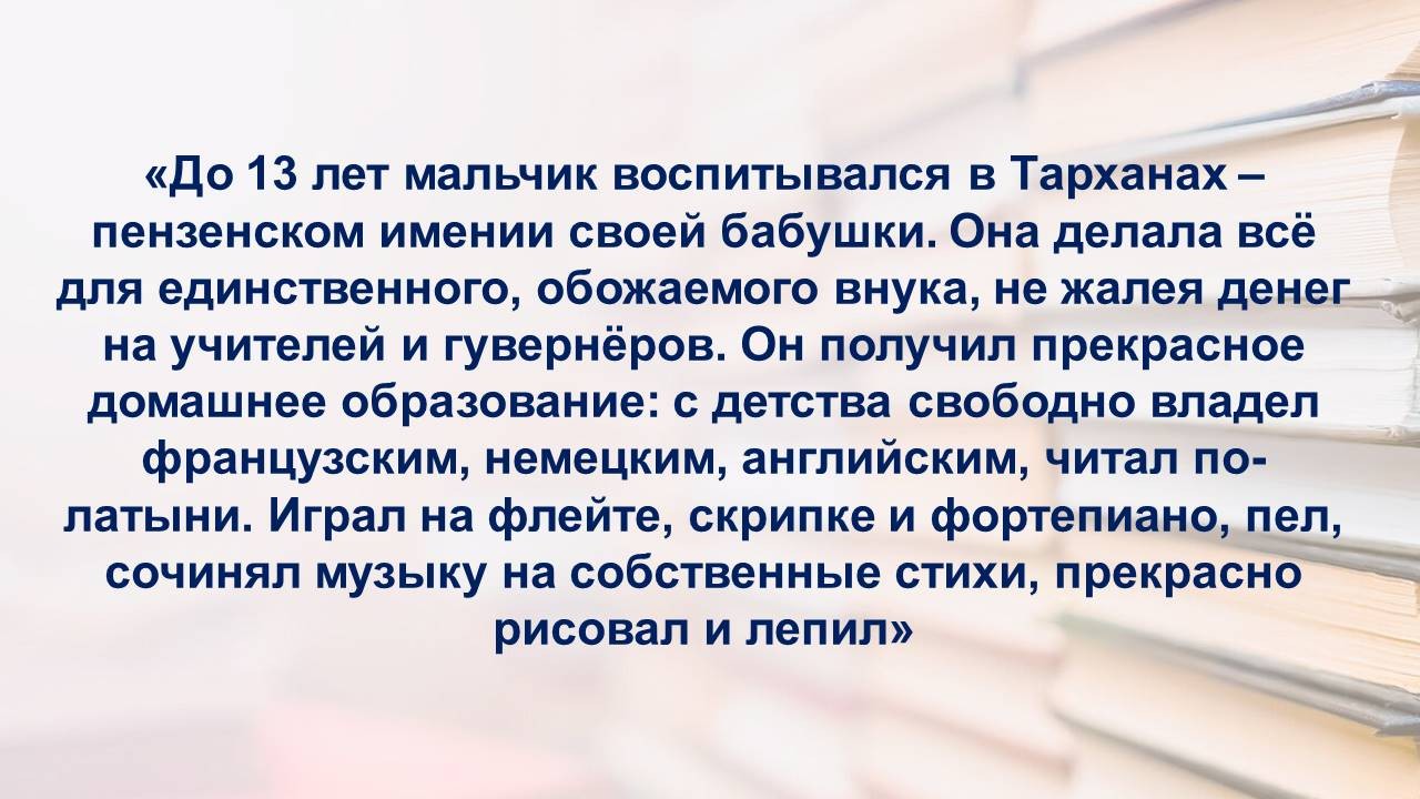 “До 13 лет мальчик воспитывался в Тарханах – пензенском имении своей бабушки. Она делала всё для единственного, обожаемого внука, не жалея денег на учителей и гувернёров. Он получил прекрасное домашнее образование: с детства свободно владел французским, немецким. Английским, читал по-латыни, играл на флейте, скрипке и фортепиано, пел, сочинял музыку на собственные стихи, прекрасно рисовал и лепил.”