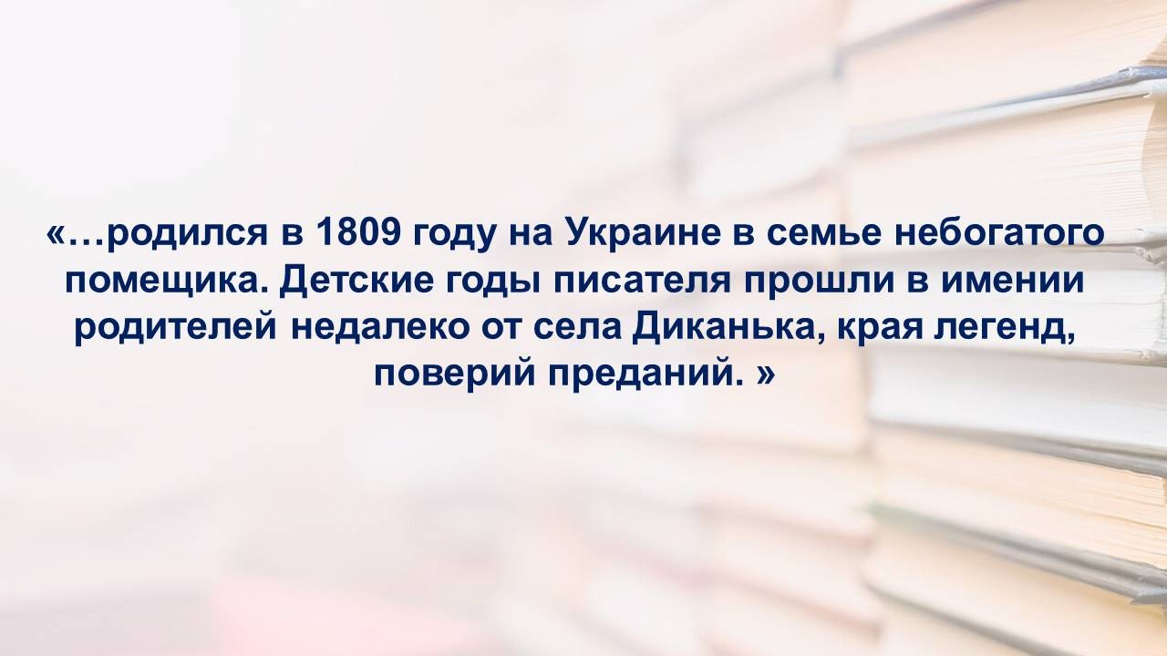 “…родился в 1809 году на Украине в семье небогатого помещика. Детские годы писателя прошли в имении родителей недалеко от села Диканька, края легенд, поверий преданий.”