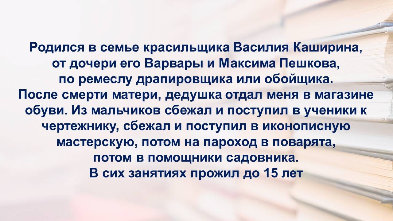 “Родился в семье красильщика Василия Васильевича Каширина, от дочери его Варвары и Максима Пешкова, по ремеслу драпировщика или обойщика. После смерти матери, дедушка отдал меня в магазине обуви. Из мальчиков сбежал и поступил в ученики к чертежнику, сбежал и поступил в иконописную мастерскую, пот ом на пароход в поварята, потом в помощники садовника. В сих занятиях прожил до 15 лет.” (Слайд 12. Максим Горький)