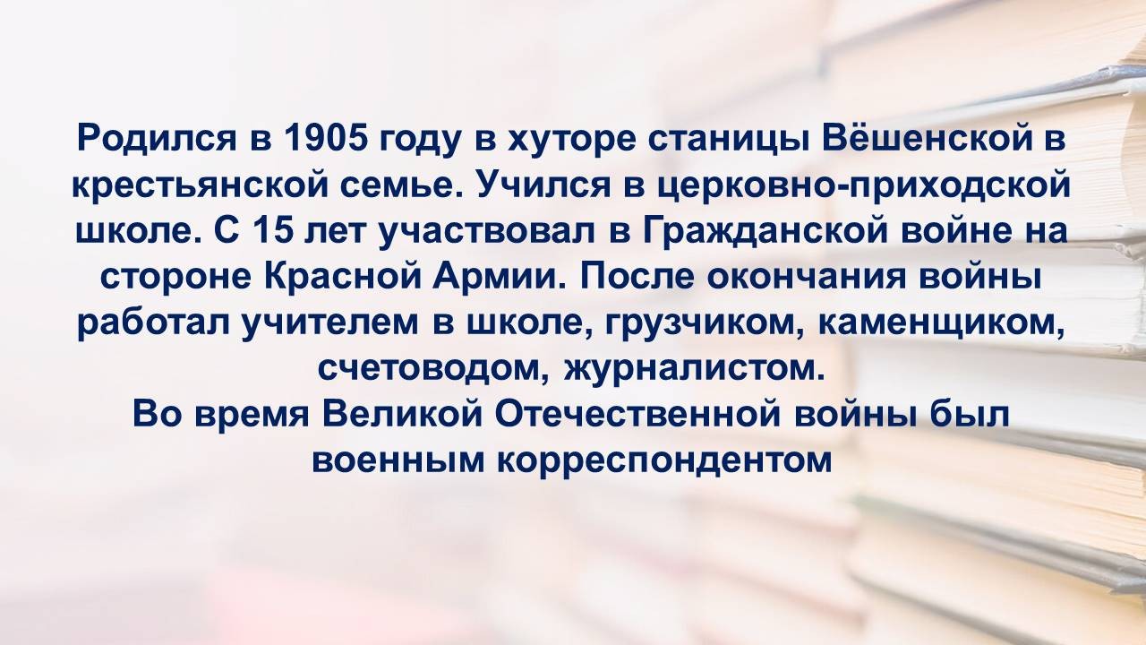 Родился в 1905 году в хуторе станицы Вёшенской в Крестьянской семье. Учился в церковно-приходской школе. С 15 лет участвовал в Гражданской войне на стороне Красной Армии. После окончания войны работал учителем в школе, грузчиком, каменщиком, счетоводом, журналистом. Во время Великой Отечественной войны был военным корреспондентом (Слайд 15. М.А.Шолохов)