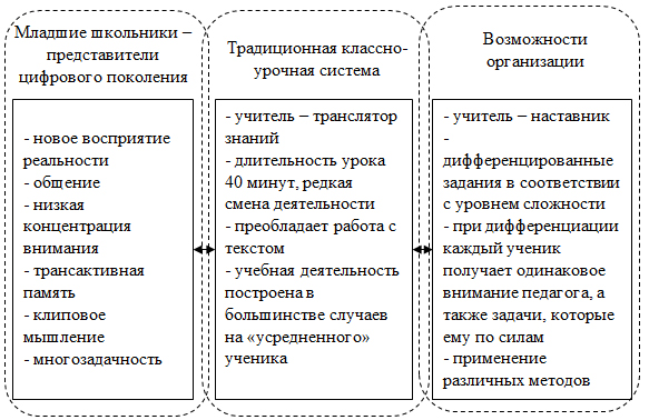 Изменения в различных областях жизни создают необходимость поиска и реализации новых подходов к развитию современной образовательной системы. И повышение внимания к проблемам организации обучения для младших школьников с разными способностями, является естественной и объективной потребностью современного образовательного процесса. С.А.Старостина отмечает, что «школьники должны развиваться полноценно, но сегодня от учителя не требуется повысить нагрузку и увеличить объем заданий, а рекомендуется вовлечь всех учеников в познание нового материала, учесть индивидуальность каждого школьника в познании нового» [44, с. 38]. В таких условиях ученики с высоким потенциалом и различными способностями часто не получают необходимой нагрузки и стимулов, тогда как для отстающих учащихся процесс обучения становится весьма затруднительным.