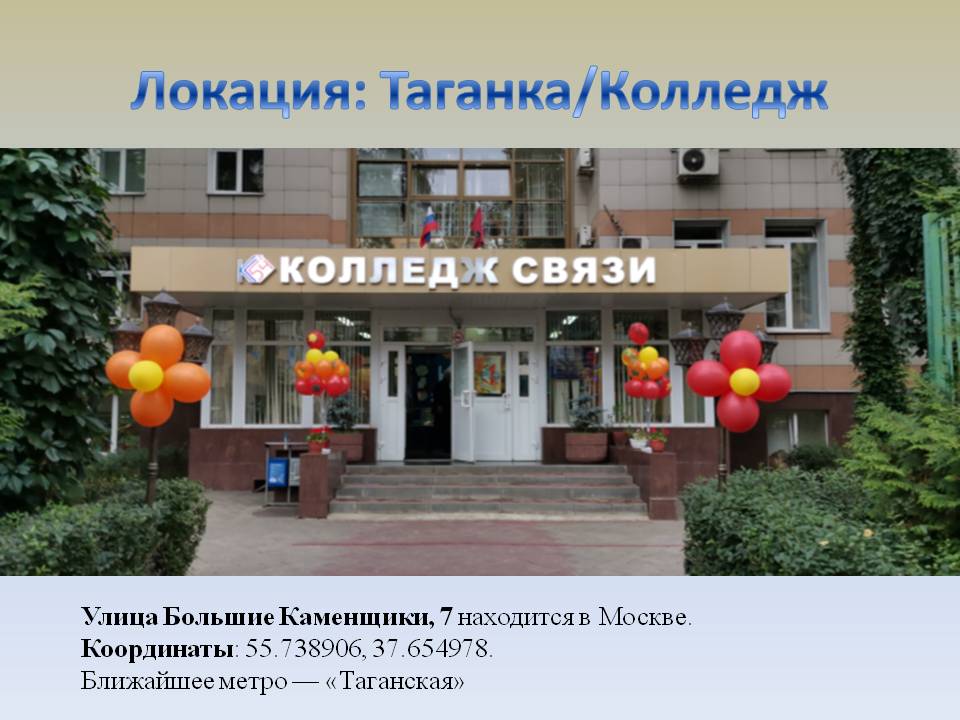 Здание нашего колледжа находится на улице Большие Каменщики Таганского района города Москвы и многие первокурсники, поступив в колледж, мало, а некоторые и вовсе ничего не знают о районе, где им предстоит провести студенческие годы, о Таганке.