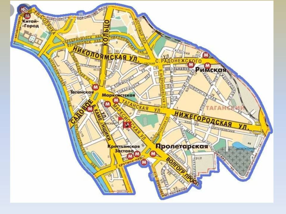 С гербом района и его символами мы разобрались, давайте рассмотрим карту района Таганский и узнаем, какие улицы и переулки находятся в районе, какие набережные и какие станции метро находятся на его территории.