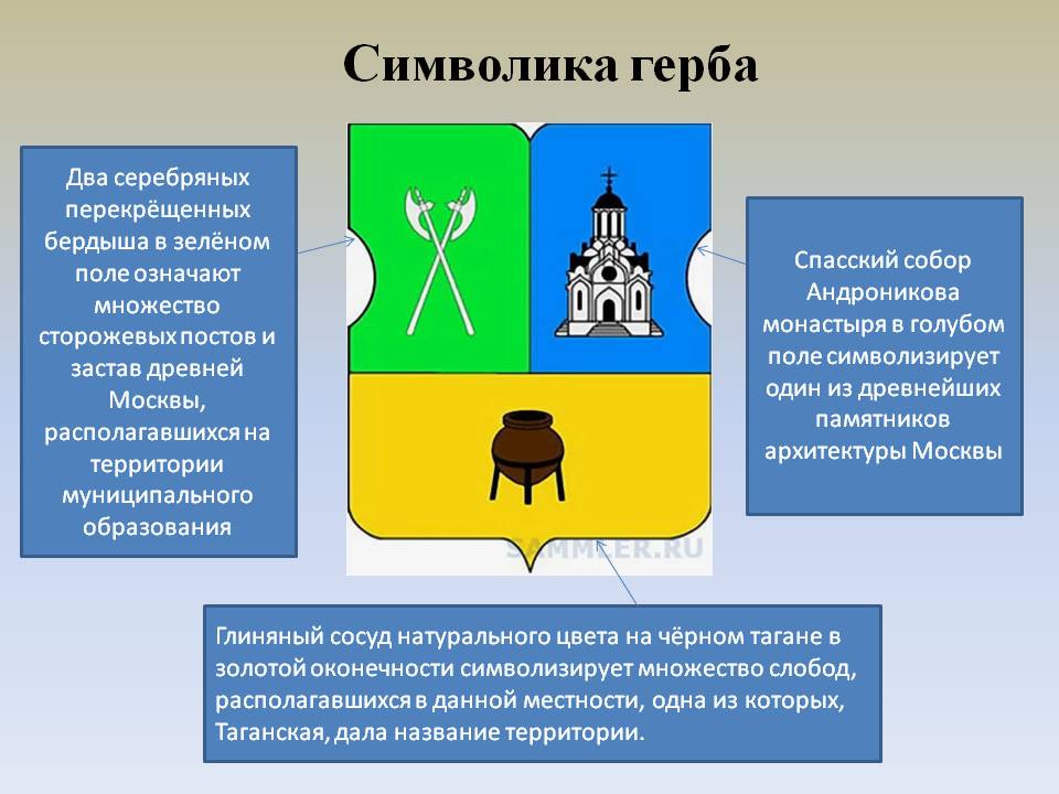 Вот и у Таганского района есть свой герб и флаг, давайте посмотрим, что размещено на гербе района.