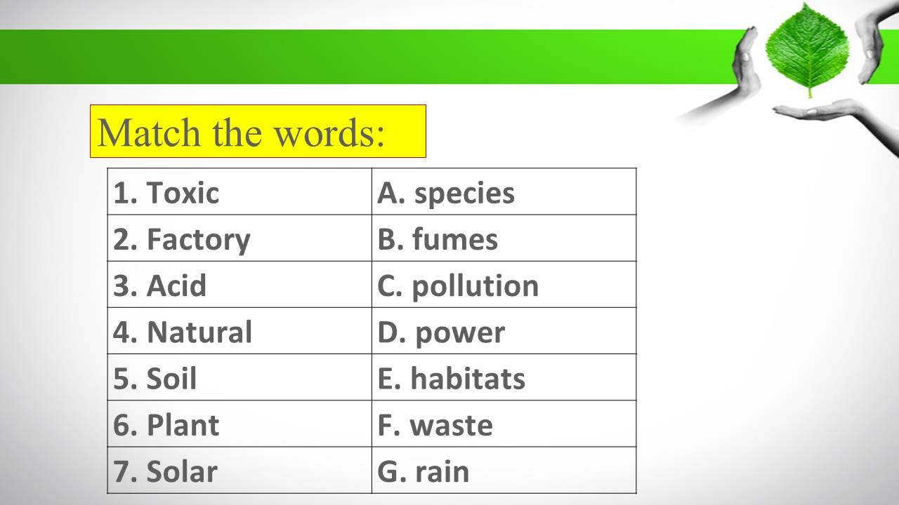 - активизировать знания, умения и навыки учащихся по теме «Окружающая среда»;