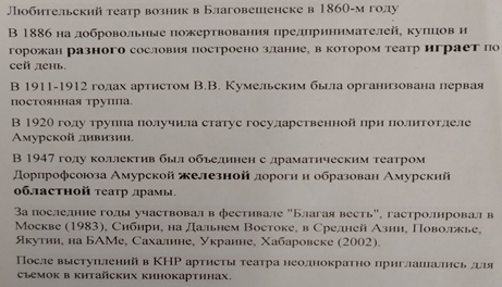 - Обрати внимание, на обратной стороне фото есть конверт, в котором лежат предложения об одном из театров г. Благовещенск. Твоя задача составить из них текст.