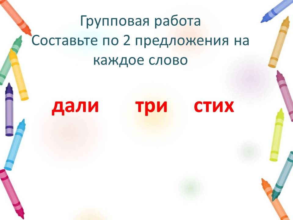 Следующее задание в тетради по группам. Составьте предложения. Первая группа – дали, вторая группа – три, а третья группа – стих. Проверим. А какой частью речи являются эти слова?