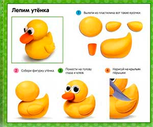 Материал: пластилин, доски для лепки, стеки, макет утки.