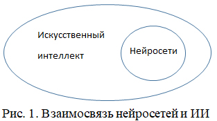 Говоря об ИИ, следует упомянуть о нейросетях. Нейросеть - математическая модель, которая, вдохновляясь принципами работы биологических нейронов, способна обучаться на примерах. [3] На языке математики, нейросеть - это подмножество множества ИИ (рис. 1). Таким образом, говоря о нейросетях, мы имеем ввиду и ИИ.