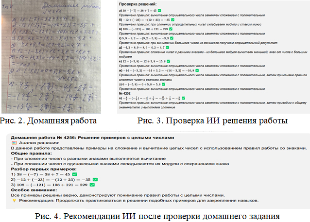 - проверка домашнего задания (достаточно сфотографировать и загрузить работу ученика (рис. 2) в приложение, например, Homiwork, после чего ИИ сделает проверку решения (рис. 3), а также проведет анализ и даст рекомендации (рис. 4);