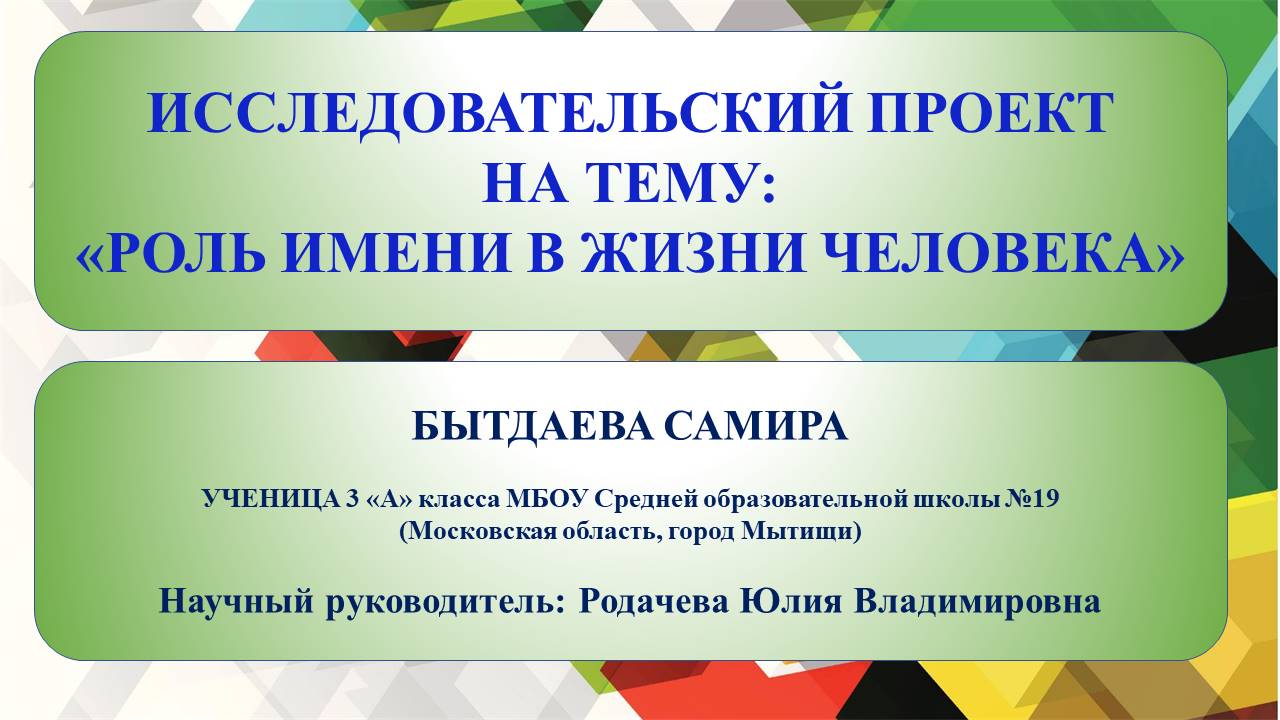 Исследовательский проект "Роль имени в жизни человека" Родачева Юлия Владимировна, Учитель начальных классов Разделы: Начальная школа Класс: 3 Ключевые слова: проектная деятельность Работа выполнена в форме презентации 4.06.2025