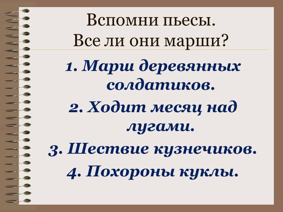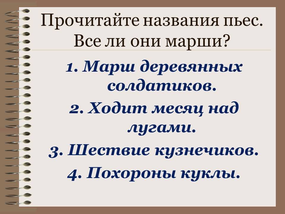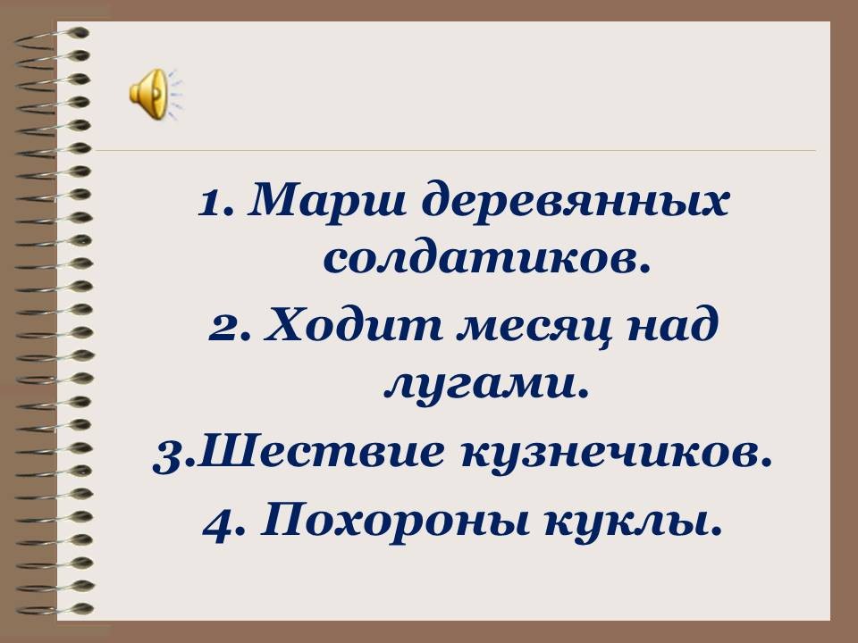 Слайд 1. На экране названия пьес: шествие кузнечиков, ходит месяц над лугами, марш, марш деревянных солдатиков, похороны куклы.