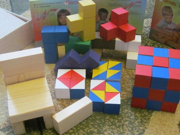 Для развития конструктивной деятельности и интеллектуально-творческих способностей можно использовать развивающие игры серии «Кубики Никитина». В серию входят игры: «Сложи узор», «Сложи квадрат», «Уникуб», «Кирпичики», «Кубики для всех», «Логические кубики» и др. Работу с кубиками рекомендуется начинать с наборов «Сложи узор» и «Сложи квадрат», а затем постепенно добавляются новые наборы, например, «Уникуб».