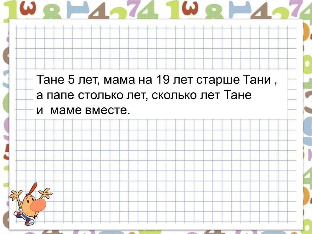 Тане 5 лет, мама на 19 лет старше Тани, а папе столько лет, сколько лет Тане и маме вместе. Поставьте вопрос и решите задачу.