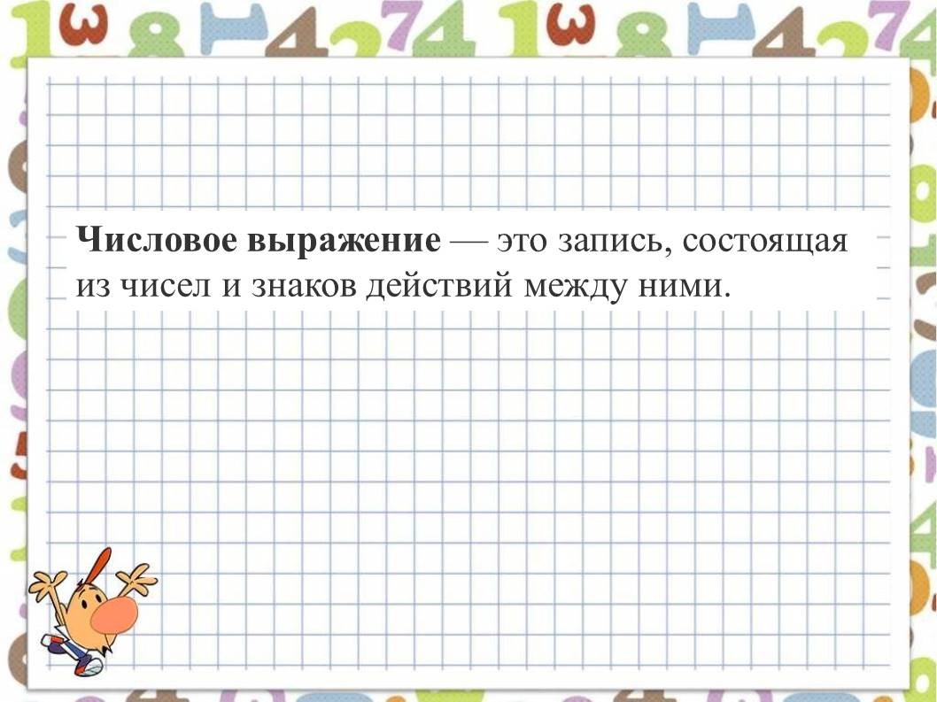 Числовое выражение — это запись, состоящая из чисел и знаков действий между ними.