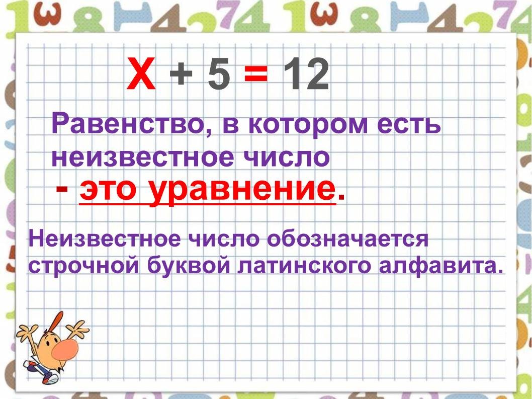 Уравнение это (показываю на знак «=») равенство, которое содержит (показываю на Х) неизвестное число.