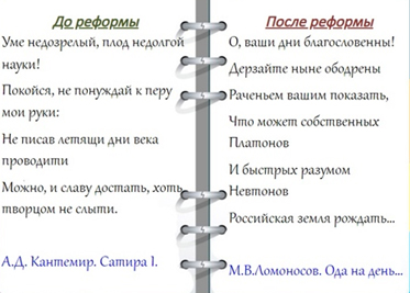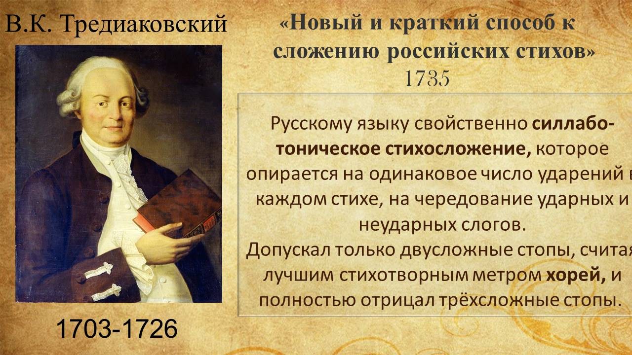 Русские писатели-классицисты любили теоретизировать, составлять поэтические трактаты, регламентировать искусство. Поговорим поподробнее о самой важной реформе русского стихосложения – о реформе Тредиаковского-Ломоносова. Её суть: поскольку в русском стихе ударение не закреплено за определенным слогом, то силлабика, пригодная для языка с постоянным ударением, русскому стихосложению не подходит.