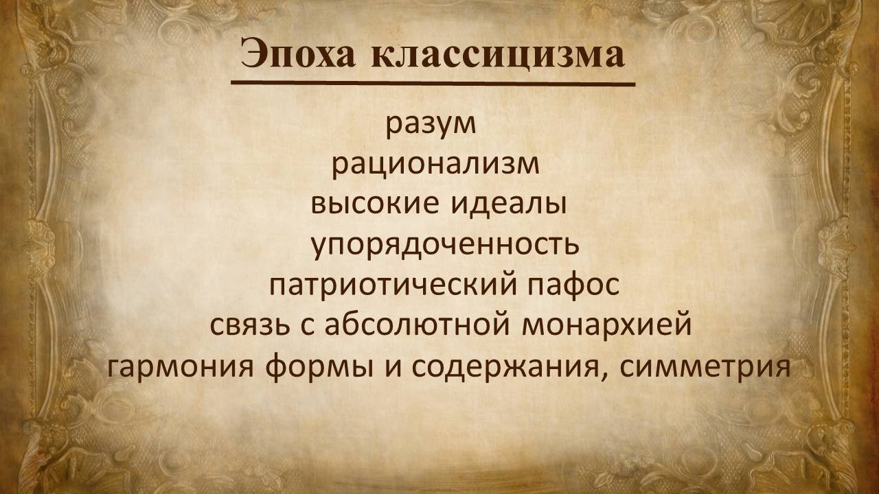 1 слайд. Итак, мы продолжаем изучение классицизма – художественного направления, признававшего античное искусство высшим образцом, а произведения античности – художественной нормой. От какого латинского слова произошло название этой эпохи? (classicus – «образцовый»)