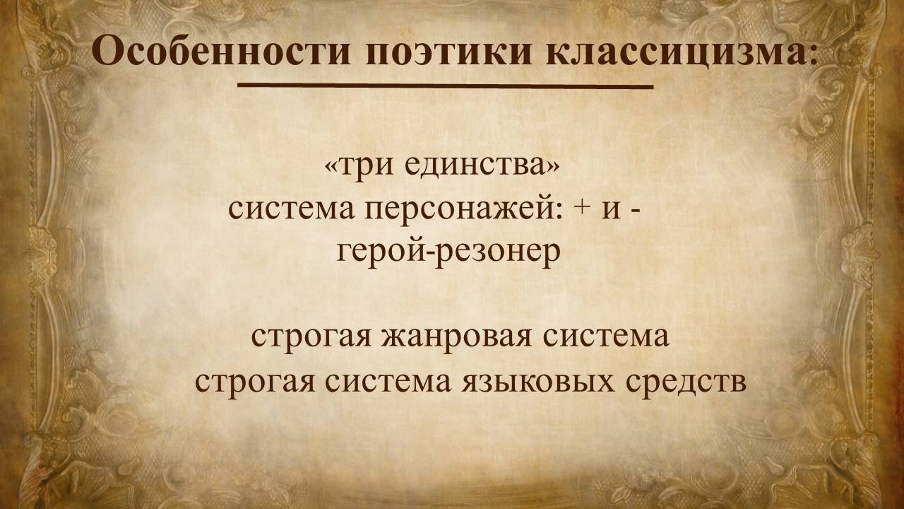 6 слайд. Многие, наверное, помнят особенности поэтики классицизма, то есть совокупность приемов, с которыми вы уже сталкивались на уроках литературы. Кто может пояснить первые три пункта (особенности драматических произведений классицистов: три единства, система персонажей, герой-резонер)?