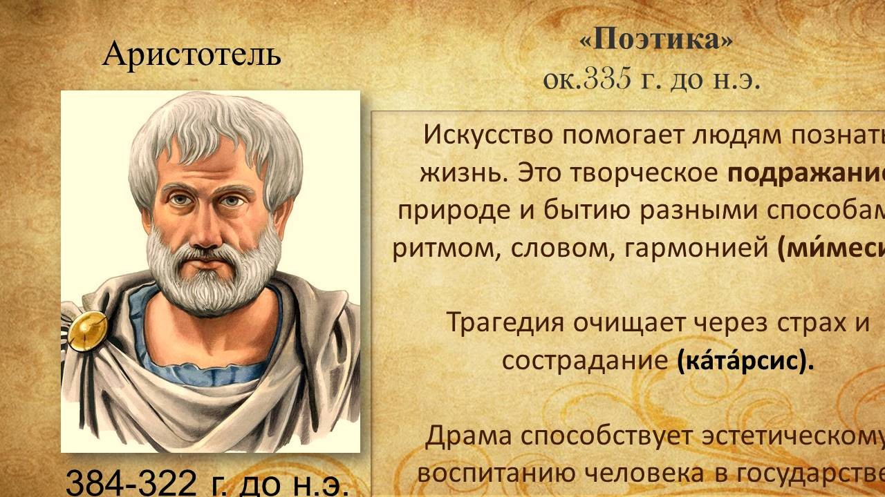 8 слайд. Аристотель считал искусство творческим подражанием природе и бытию, считал, что искусство помогает людям познать жизнь. Этот эстетический принцип подражания на языке древних греков называется МИМЕСИС. Подражание не значит копирование. В искусстве должно быть и обобщение, и художественный вымысел. Выше всех форм искусства Аристотель считал трагедию. Он использует термин «ПЕРИПЕТИЯ» как необходимый переход в трагедии от счастья к несчастью. Трагедия, как говорит Аристотель, может нравственно «очищать зрителя через страдание». КАТАРСИС – это состояние облегчения и просветления, возникающее в результате сопереживания произведению искусства. 9 слайд: узнаёте слова? – МИМЕСИС, ПЕРИПЕТИЯ, КАТАРСИС.