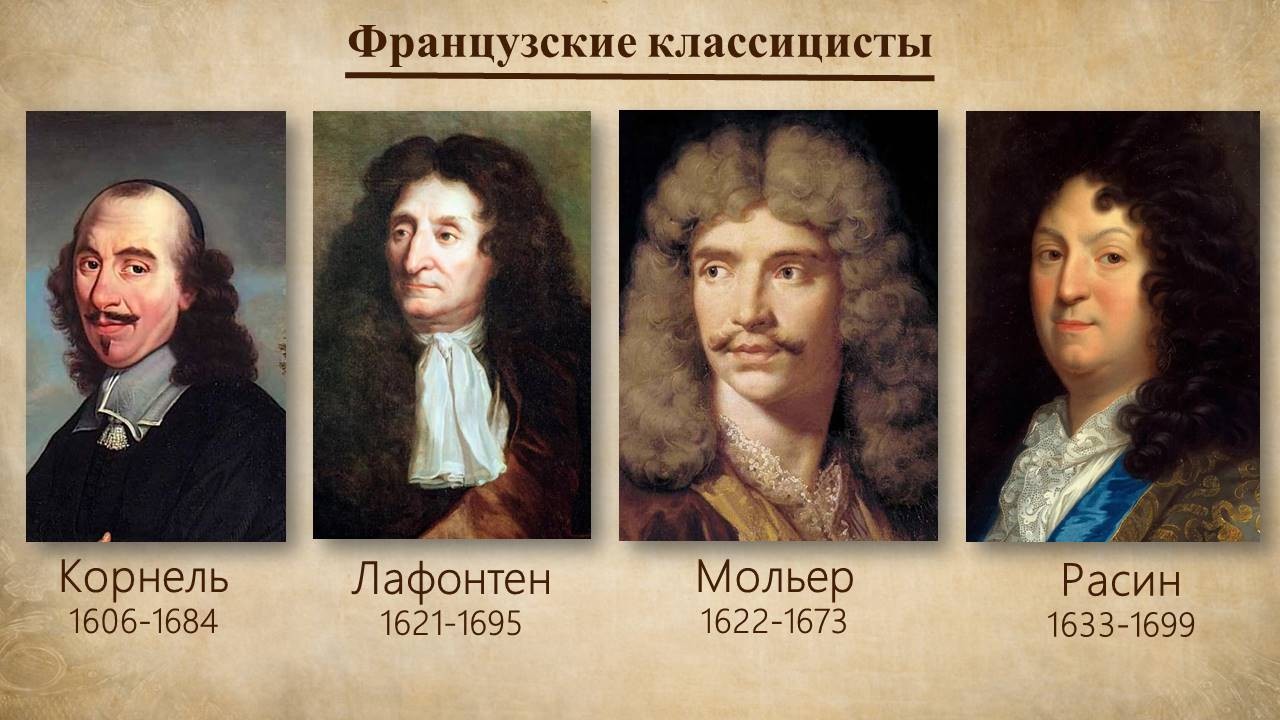 - Жан-Батист Поклен (Мольер) – создатель классической комедии (комедии «Тартюф, ли Обманщик», «Дон Жуан», «Мещанин во дворянстве», «Мнимый больной»). Для Мольера сущность комедии заключалась по преимуществу в критике общественно вредных пороков и в оптимистической вере в торжество человеческого разума.
