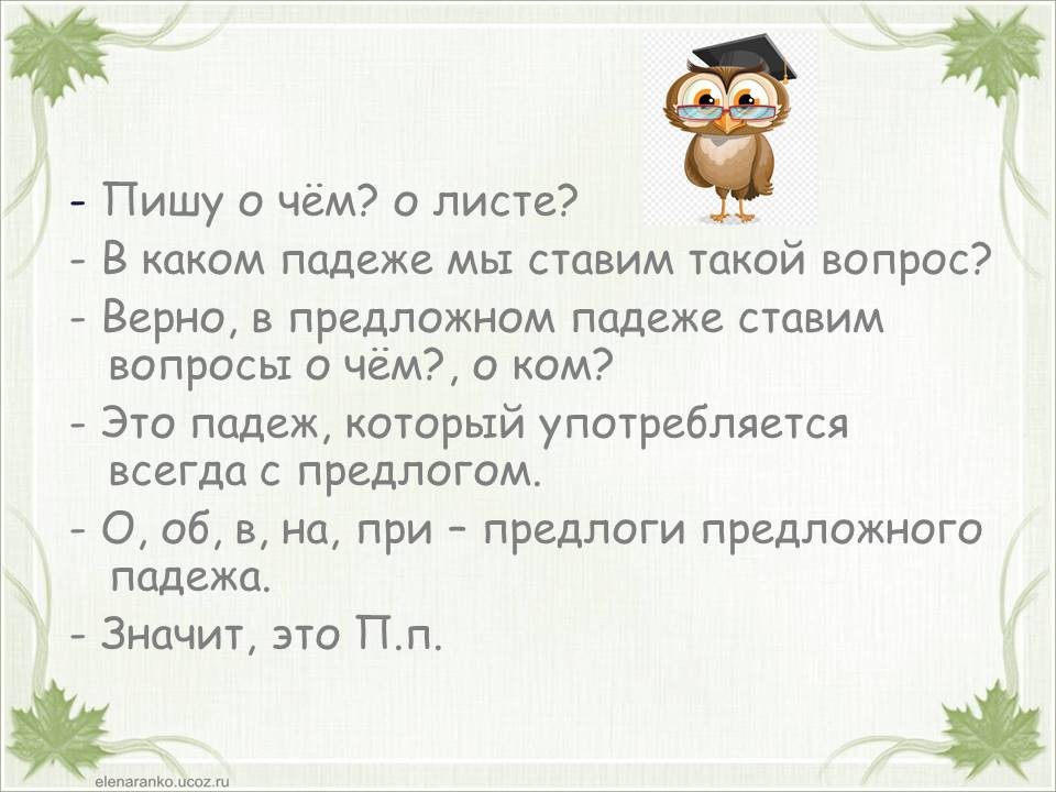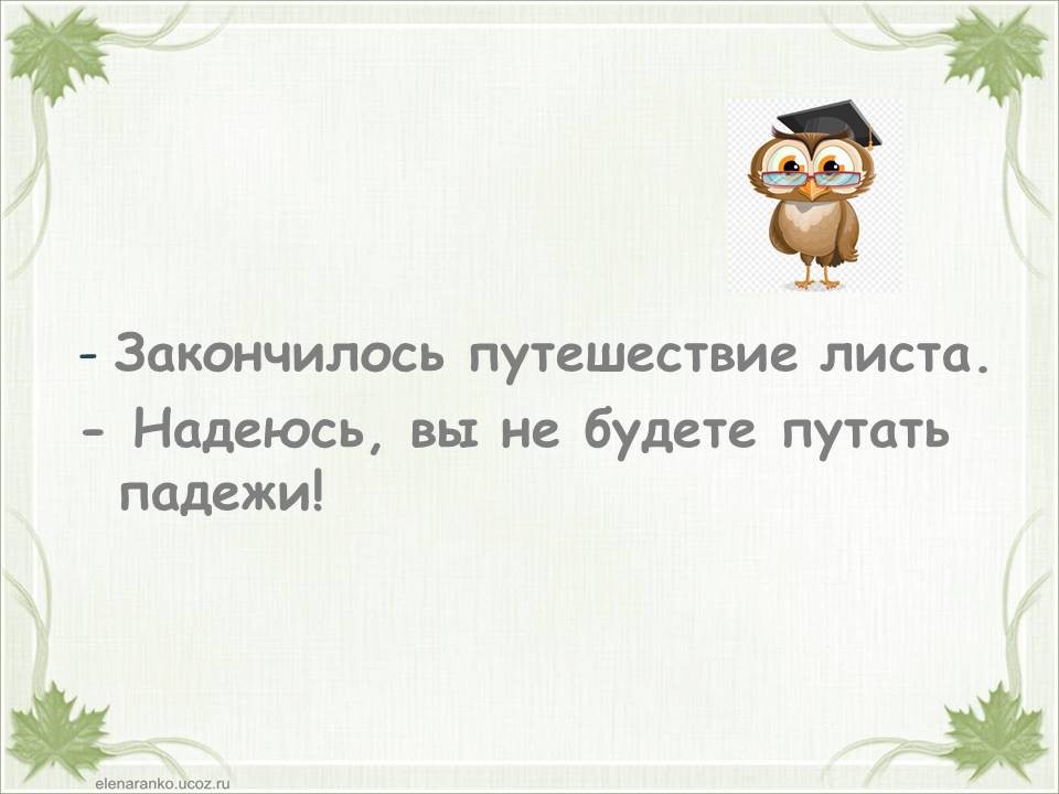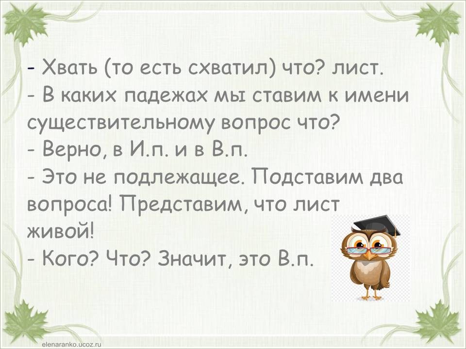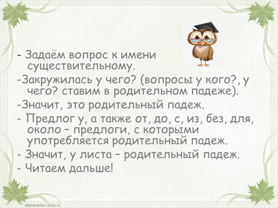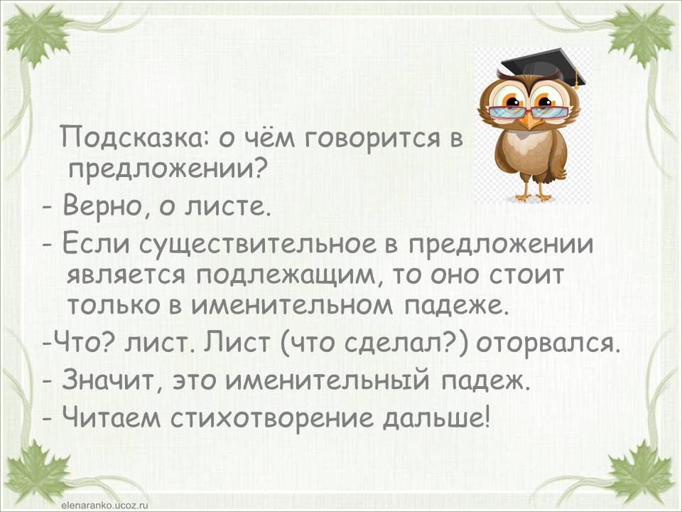 Тема «Падежи имен существительных» одна из самых сложных в курсе начальной школы. Дети часто путают родительный и винительный падежи, именительный и винительный. Однако от умения определить падеж, зависит правильность написания безударных окончаний имен существительных. Предлагаю в игровой форме научить детей определять падежи. Материал можно распечатать, прошить и использовать как брошюру. Можно работать с презентацией. Интерактивная презентация или её печатный вариант станут хорошими помощниками на этапе закрепления темы «Падежи имен существительных», а также пособие уместно использовать при работе над каждым падежом в отдельности. Можно организовать работу в паре: один ученик играет роль мудрой совы, второй – определяет падеж. Ребенок читает отрывок из стихотворения и определяет падеж имени существительного «лист». Если ученик испытывает трудности, он может воспользоваться подсказкой (перейти к следующему слайду или странице). Если ученик, верно определил падеж, он проверяет себя (переходит к следующей странице или слайду). При фронтальной работе дети читают отрывок, определяют падеж и проверяют себя (переходят к следующему слайду или странице) пока не дочитают стихотворение до конца.
