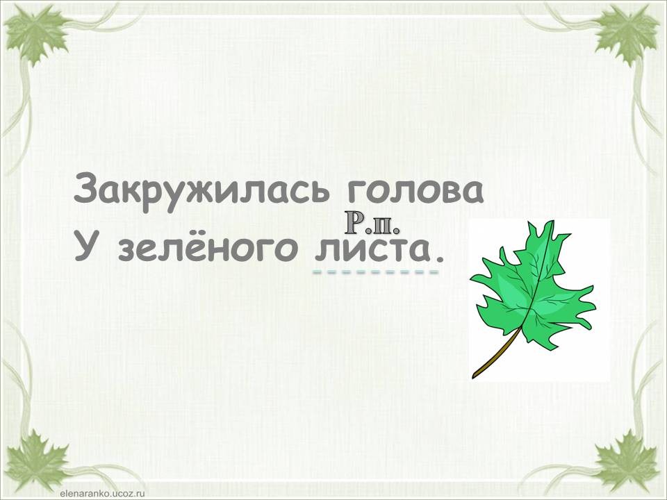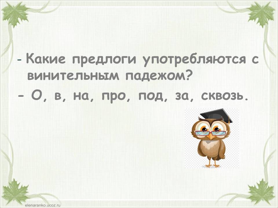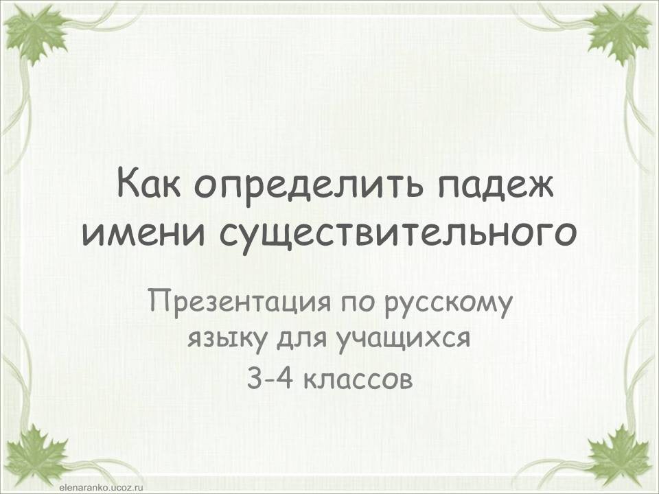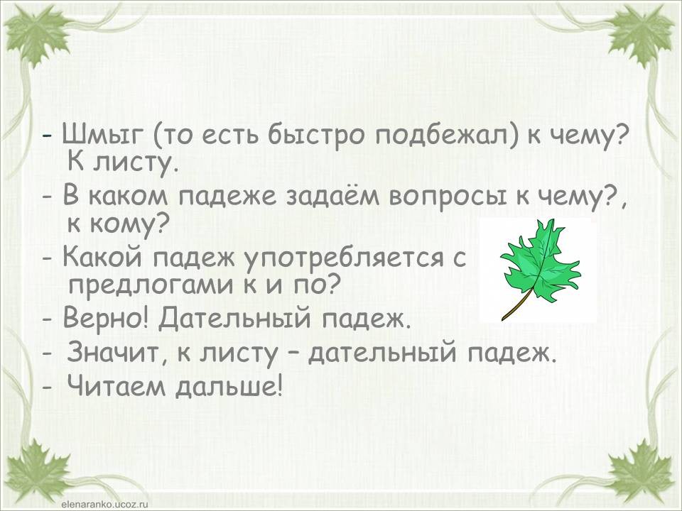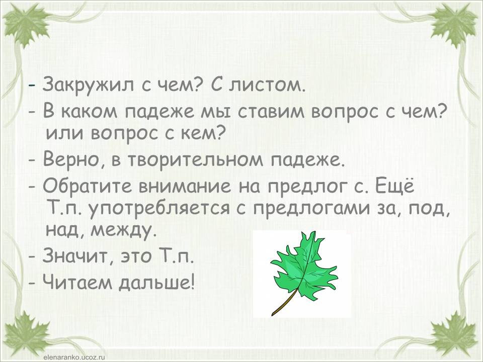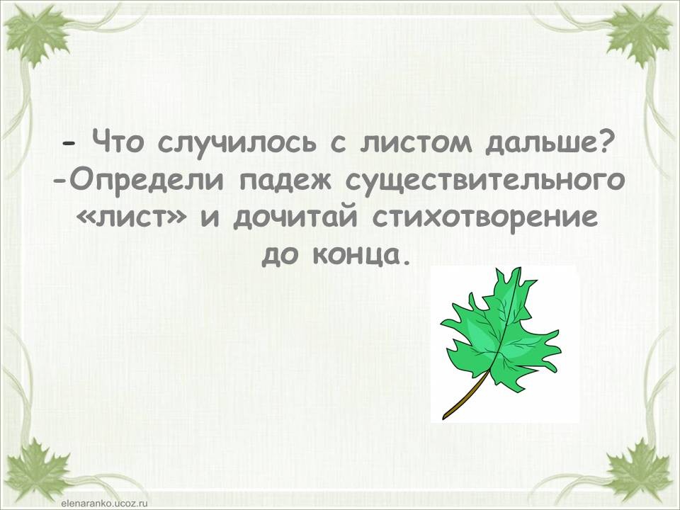 Тема «Падежи имен существительных» одна из самых сложных в курсе начальной школы. Дети часто путают родительный и винительный падежи, именительный и винительный. Однако от умения определить падеж, зависит правильность написания безударных окончаний имен существительных. Предлагаю в игровой форме научить детей определять падежи. Материал можно распечатать, прошить и использовать как брошюру. Можно работать с презентацией. Интерактивная презентация или её печатный вариант станут хорошими помощниками на этапе закрепления темы «Падежи имен существительных», а также пособие уместно использовать при работе над каждым падежом в отдельности. Можно организовать работу в паре: один ученик играет роль мудрой совы, второй – определяет падеж. Ребенок читает отрывок из стихотворения и определяет падеж имени существительного «лист». Если ученик испытывает трудности, он может воспользоваться подсказкой (перейти к следующему слайду или странице). Если ученик, верно определил падеж, он проверяет себя (переходит к следующей странице или слайду). При фронтальной работе дети читают отрывок, определяют падеж и проверяют себя (переходят к следующему слайду или странице) пока не дочитают стихотворение до конца.