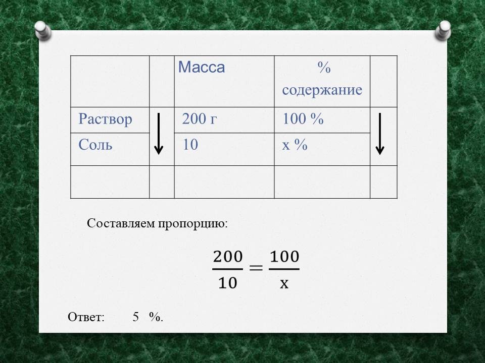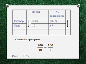 Задача №2: В сосуд налили 190 г воды и положили 10 г соли. Найдите процентное содержание соли в растворе?