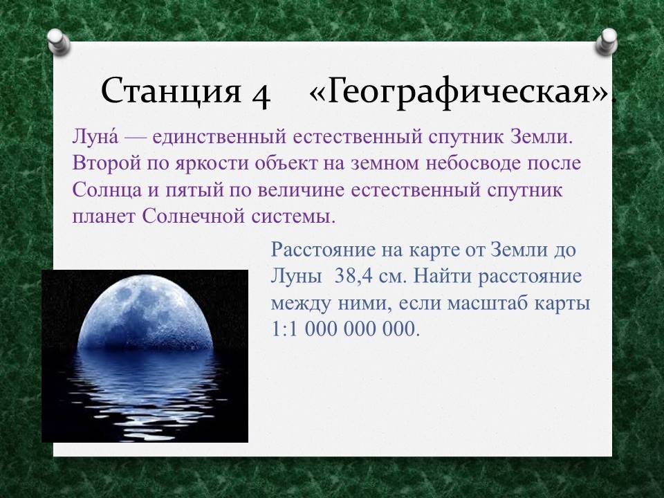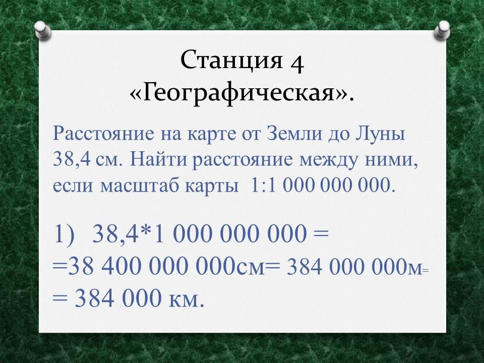 Задача №4: Расстояние на карте от Земли до Луны 38,4 см. Найти расстояние между ними в километрах, если масштаб карты 1:1 000 000 000.