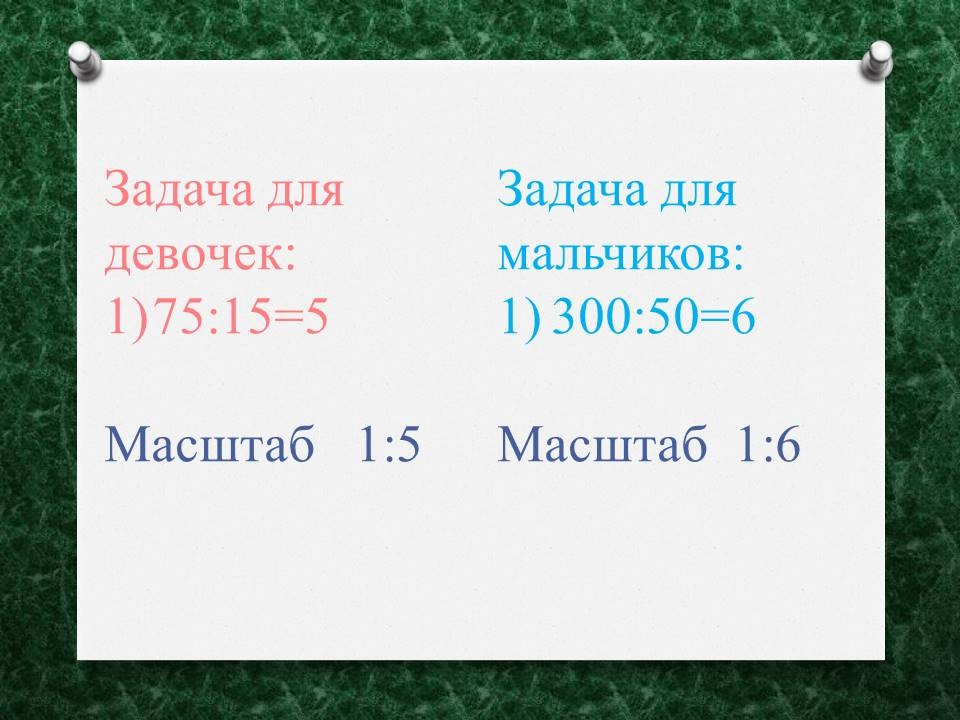 Задача №5 - для мальчиков: Длина детали 300 мм. Какой использовали масштаб, если на чертеже ее длина равна 50мм? (Слайд)