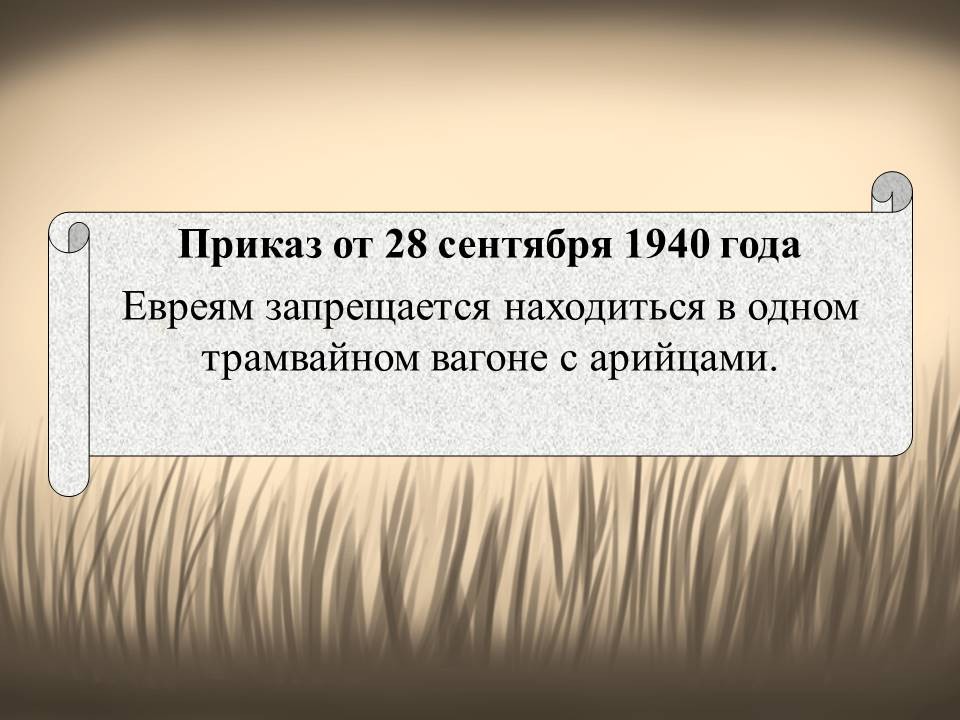 Хозяйка магазина (грустно). Да, совсем не причина… (немного помолчав, горько усмехнувшись). Джозефа уволили из оркестра. (Передразнивая приказ). «Согласно новому указу правительства евреи не могут заниматься искусством и исполнять музыку». Впрочем, согласно новым указам евреям много чего нельзя было делать. Закрыли еврейские школы. А потом по приказу немецкого командования все евреи вынуждены были переселиться в еврейский квартал. Ни войти, ни выйти оттуда нельзя было без разрешения. Вокруг была построена стена… Дедушка очень беспокоился за Джозефа и Рену.