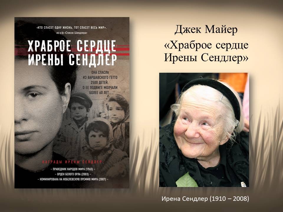 - Майер Дж. Храброе сердце Ирены Сендлер. М.: Эксмо, 2014
