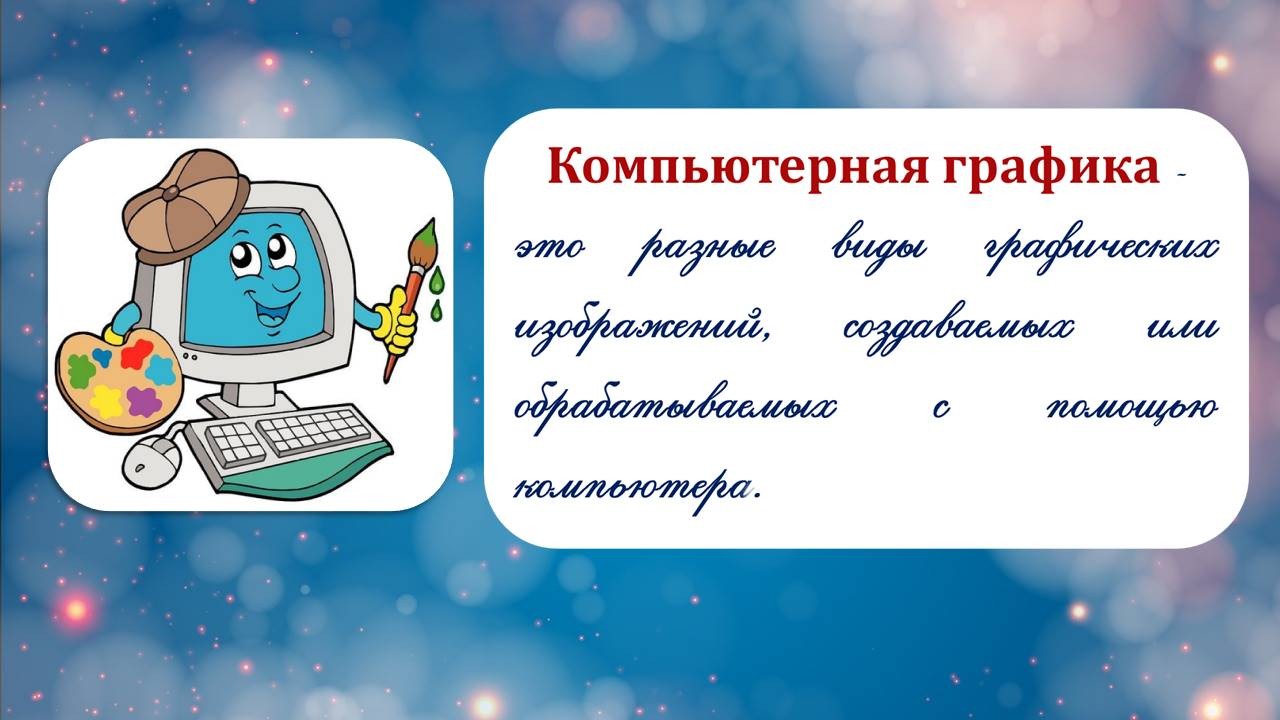 | А вас заинтересовала бы книга, не содержащая иллюстрации? Как создаются иллюстрации? У вас в опорных листах есть определение графики. На основе этого определения сформулируйте понятие компьютерной графики. Приведите примеры компьютерной графики. |