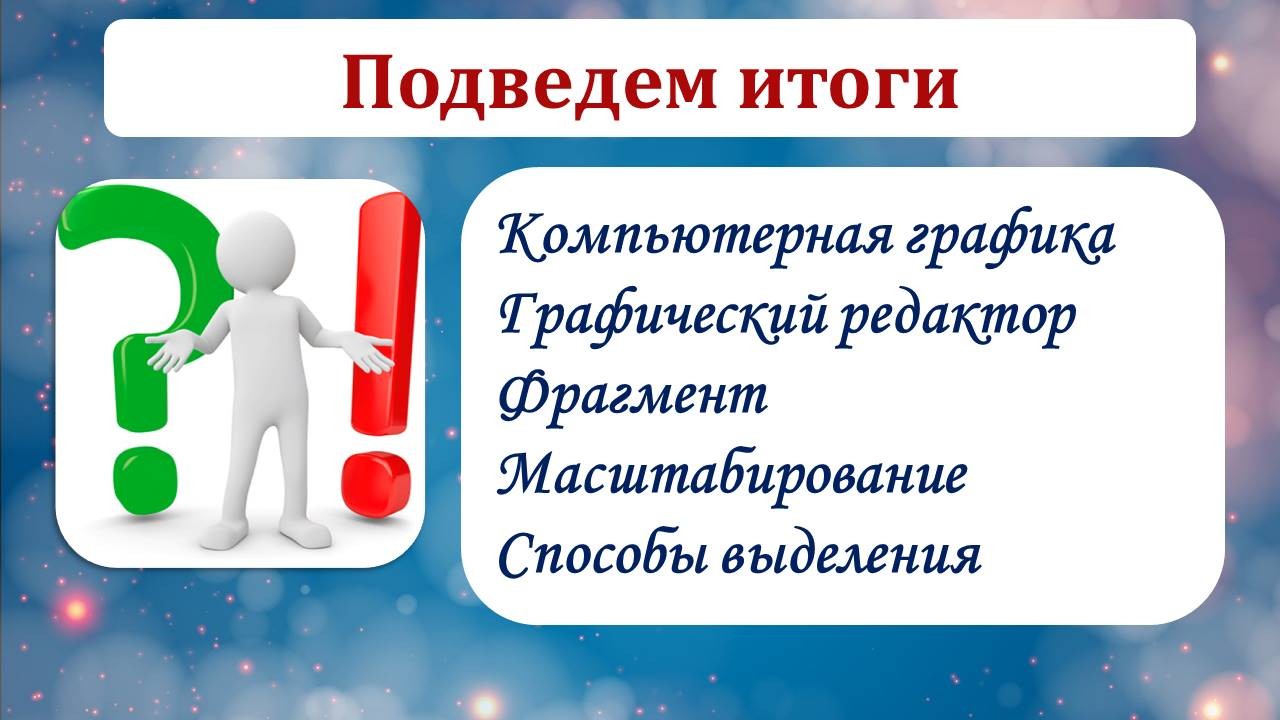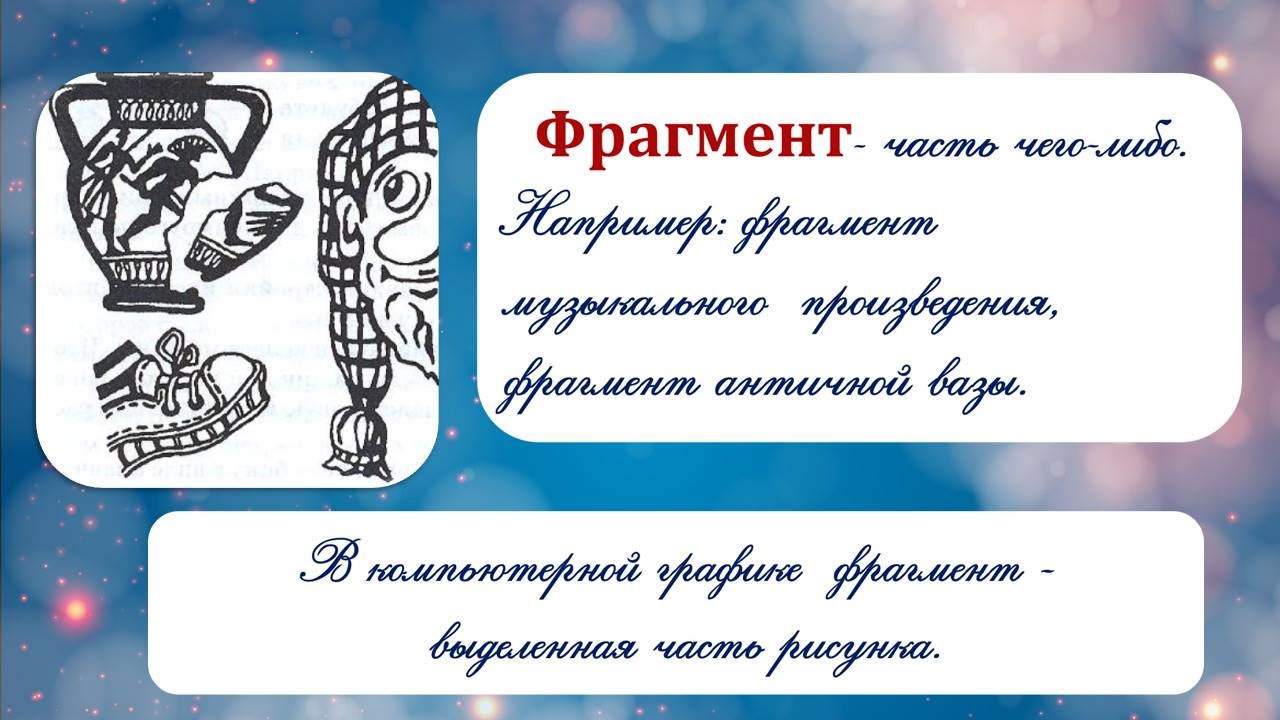 Основные понятия, рассматриваемые на уроке: графический редактор; инструменты графического редактора; фрагмент.