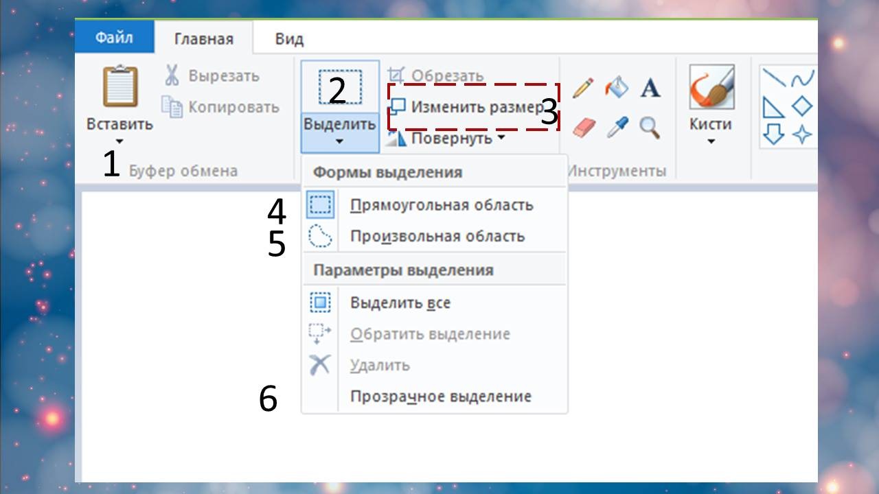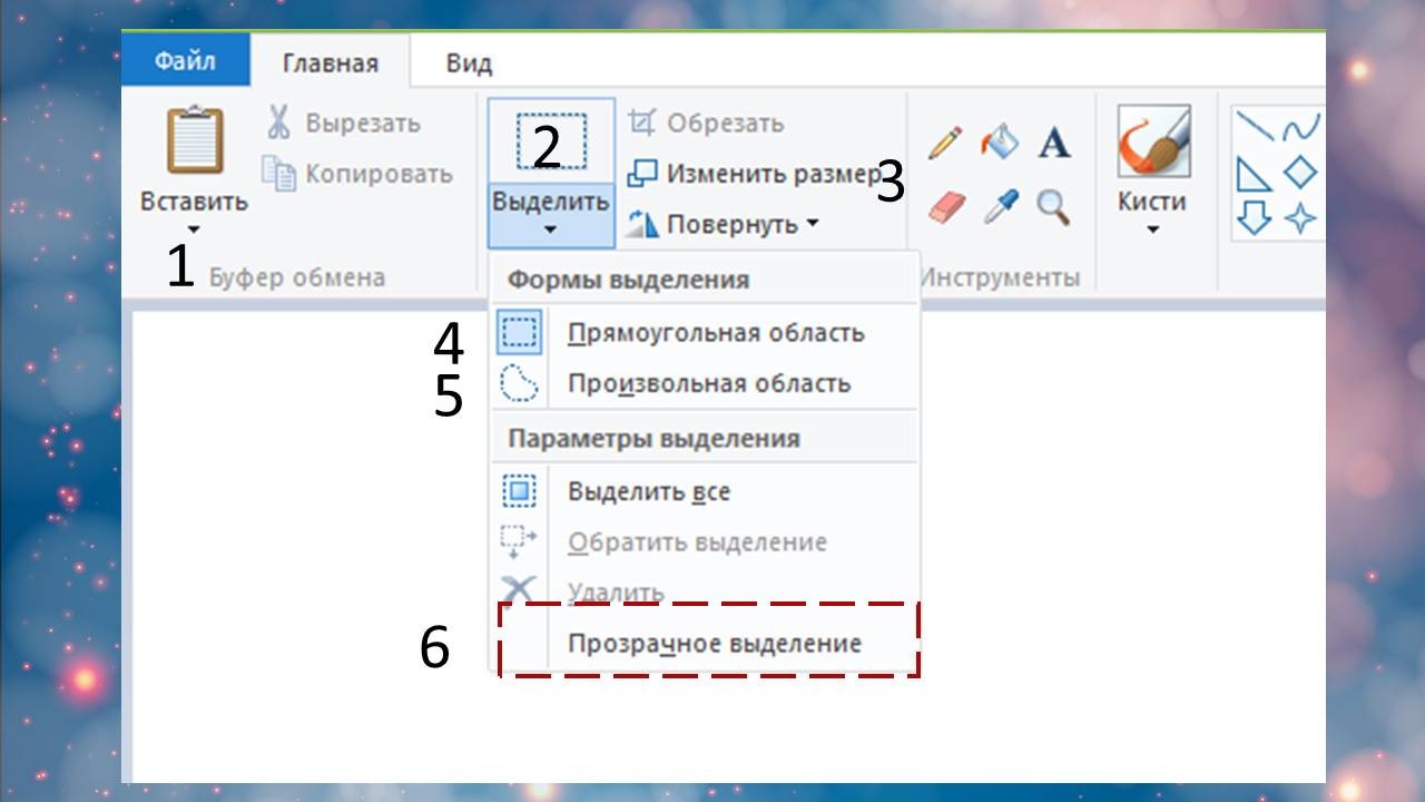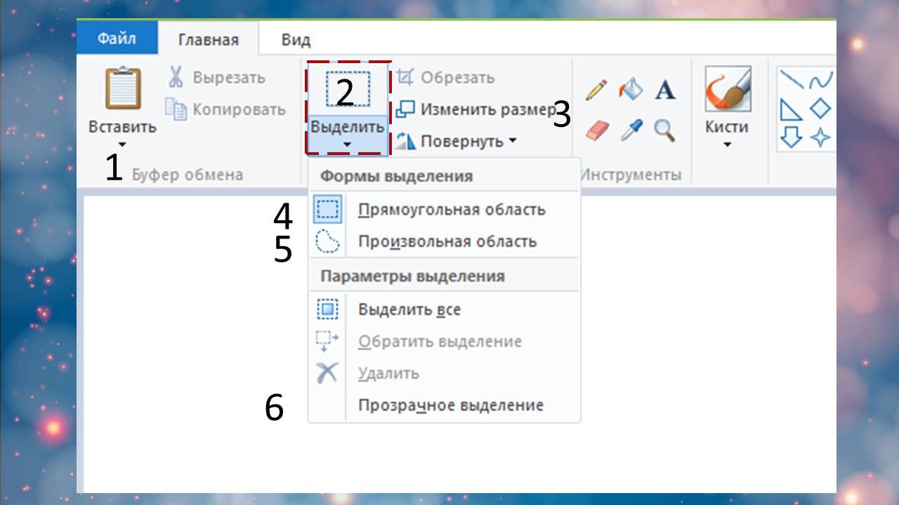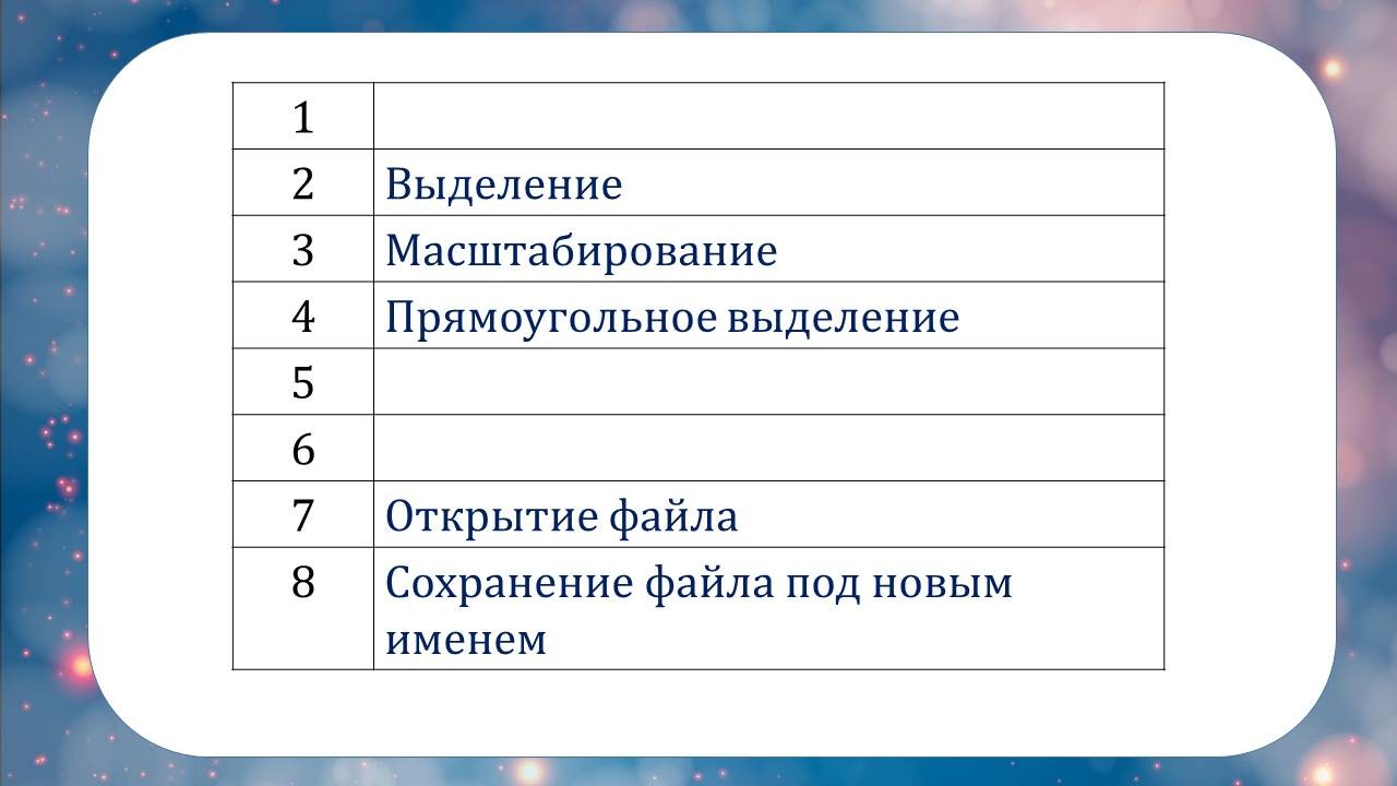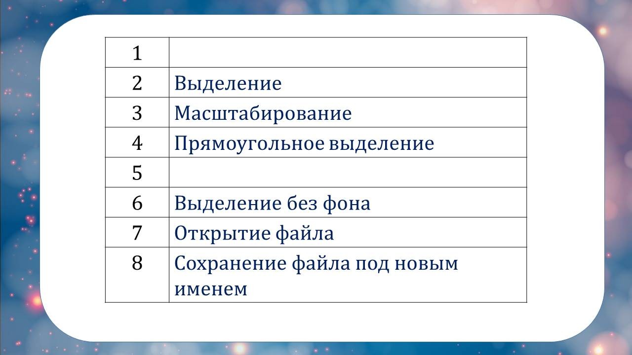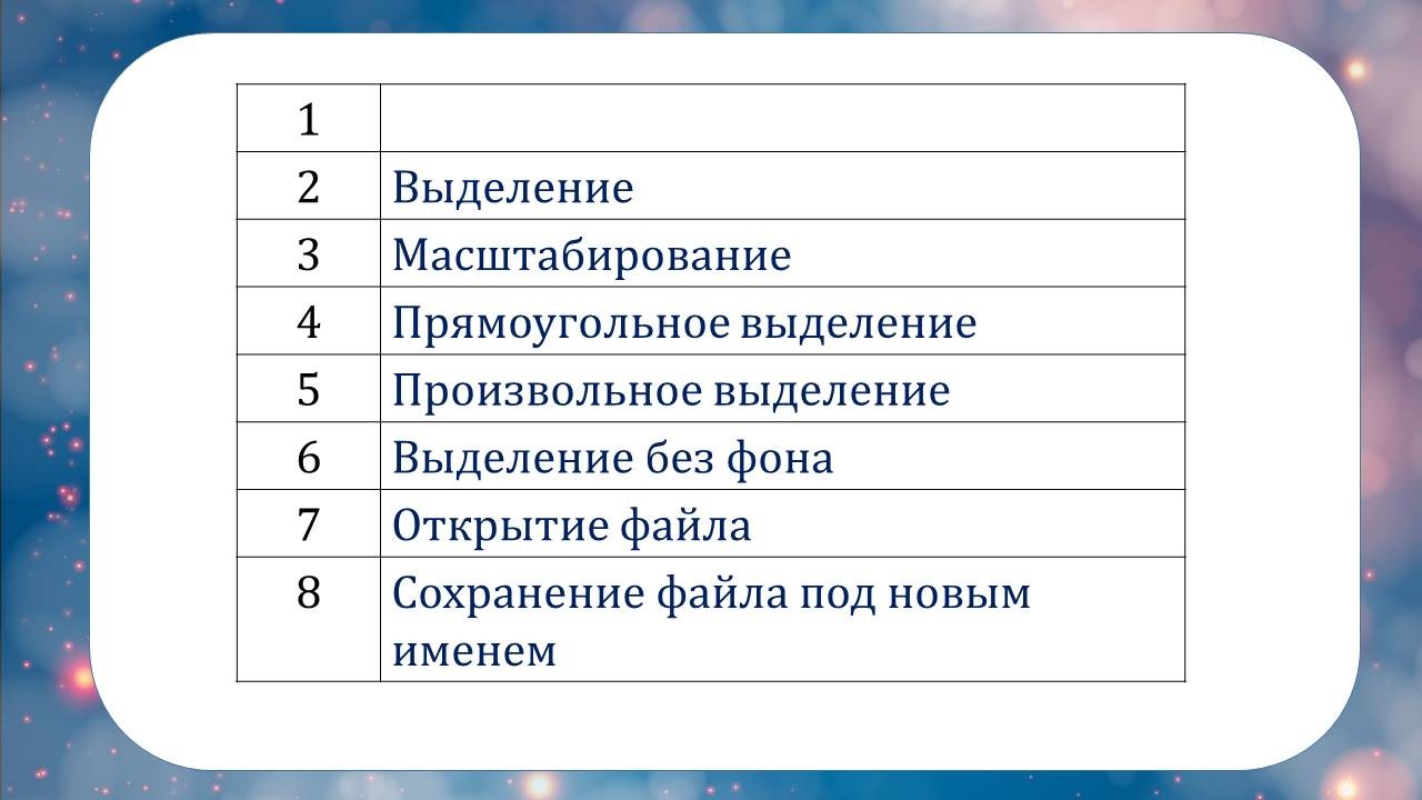 Назовите номер инструментальной кнопки, позволяющей выделить фрагмент рисунка. Именно этот инструмент мы сегодня будем чаще всего использовать. Запомните, где он находится. |