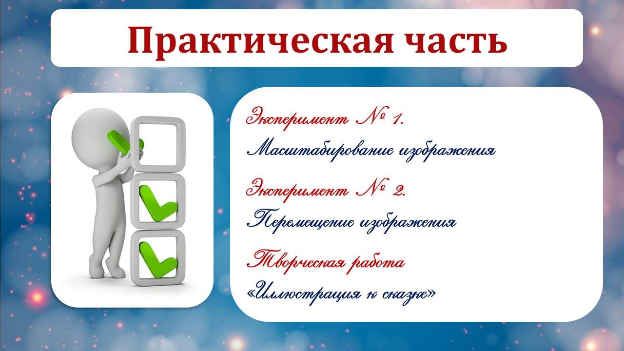 | 4. Компьютерный практикум | В практической части нашего занятия мы проведем два эксперимента и создадим иллюстрацию к сказке «Волшебная лапам Алладина». Результатом проведенных экспериментов будет заполненная таблица по названиям инструментальных кнопок и схема способов выделения фрагментов изображения. Для начала напомню алгоритм открытия файлов с заготовками. Файл – открыть. Далее выбираем файл и выполняем задание. |