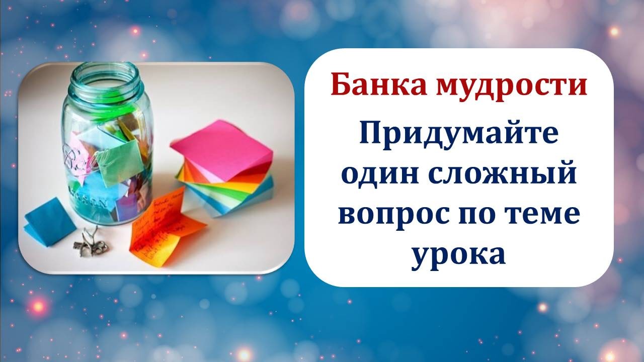 | Сегодня мы пополним нашу банку мудрости новыми интересными вопросами. Напишите, пожалуйста, на цветных стикерах один сложный вопрос по теме урока и сложите их в банку мудрости. |