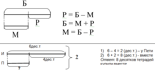 - Задача 2. «Игорь купил 6 десятков тетрадей, что на 4 десятка больше, чем Петя. Сколько десятков тетрадей купили мальчики вместе?»