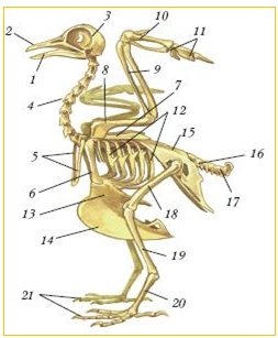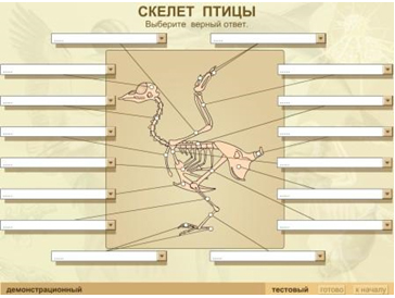 Индивидуальная проверка знаний особенностей строения скелета и мускулатуры птиц, связанных с полетом. (Ответы учащихся с использованием скелета птицы.)