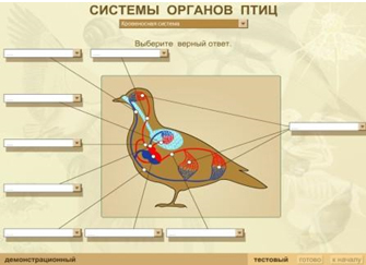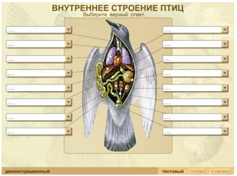Средства обучения: влажный препарат «Внутреннее строение птицы»; диск 1С:Школа. Биология.7 кл.; диск Электронный атлас школьника- Зоология; компьютер; интерактивная доска, карточки.